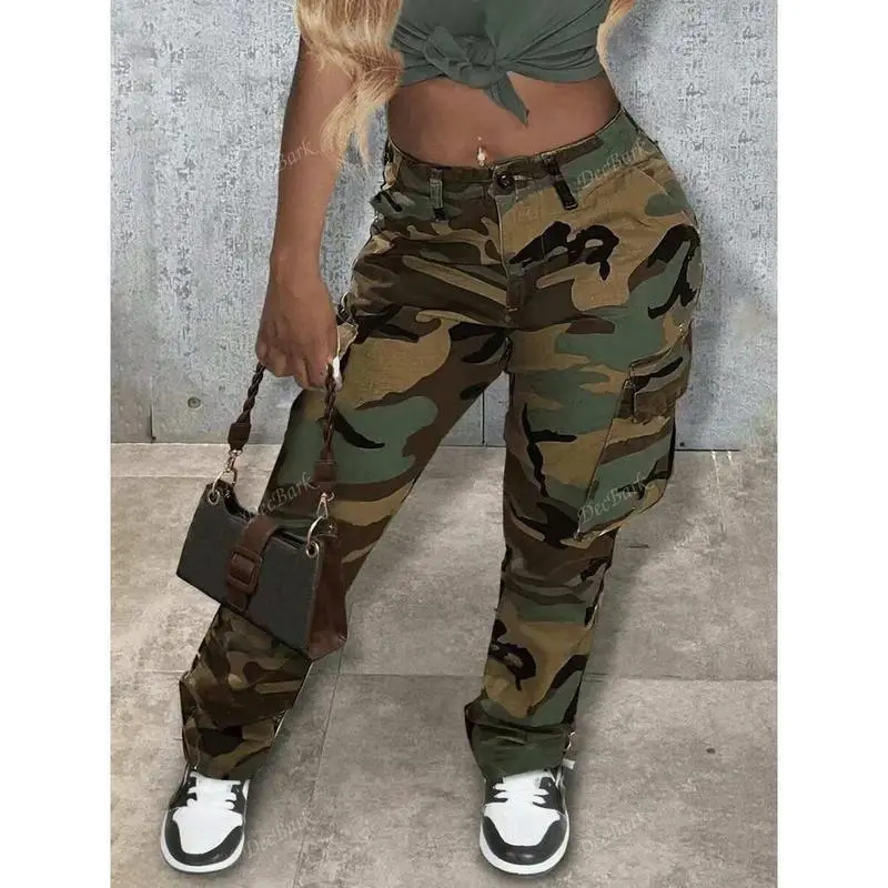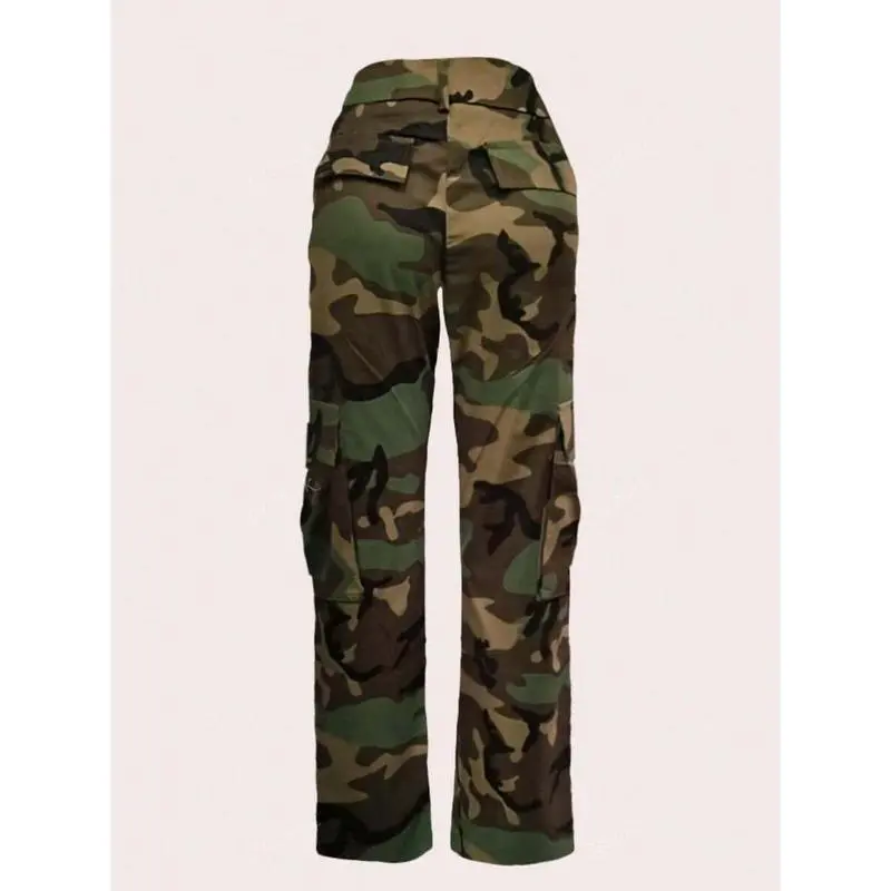 Women's Casual Camouflage Print Straight Leg Cargo Pants Fit Womenswear Green Army Bottom Polyester