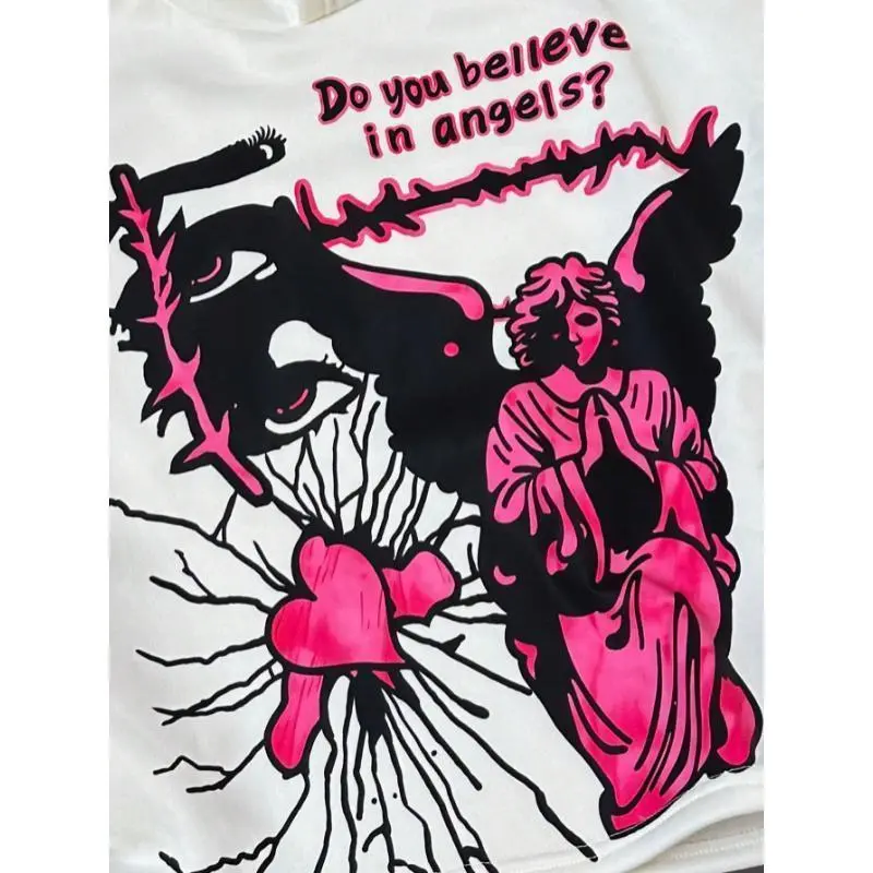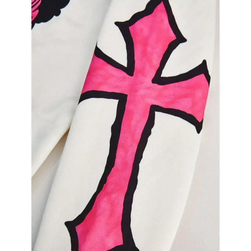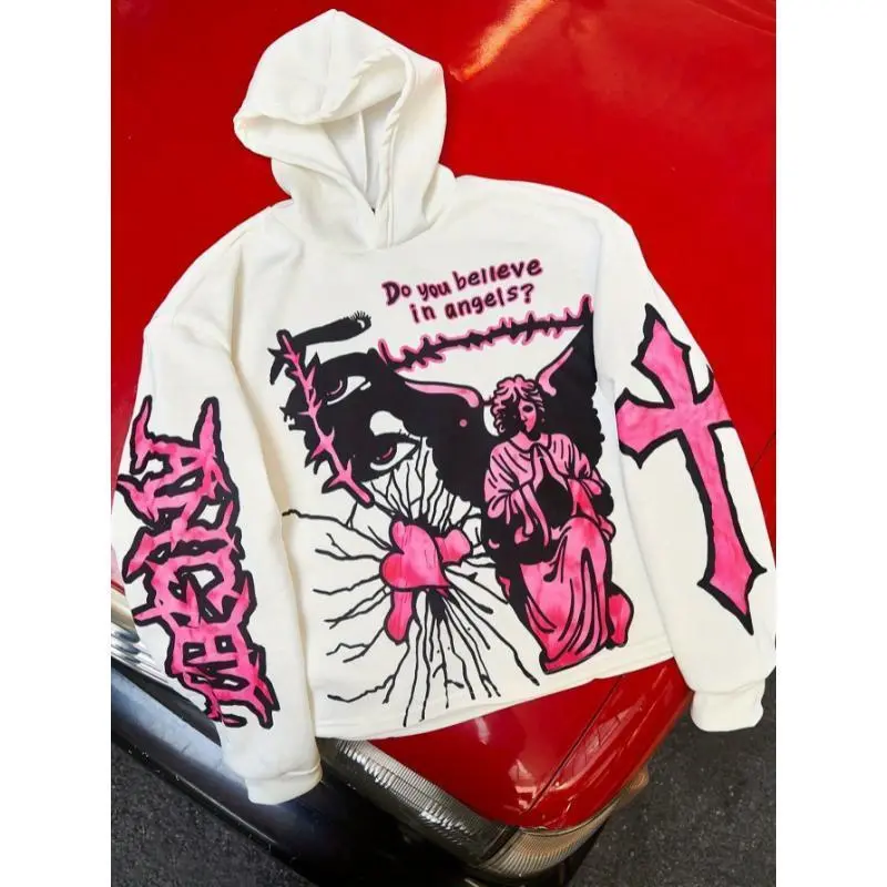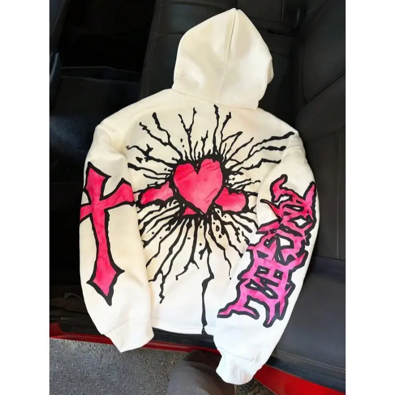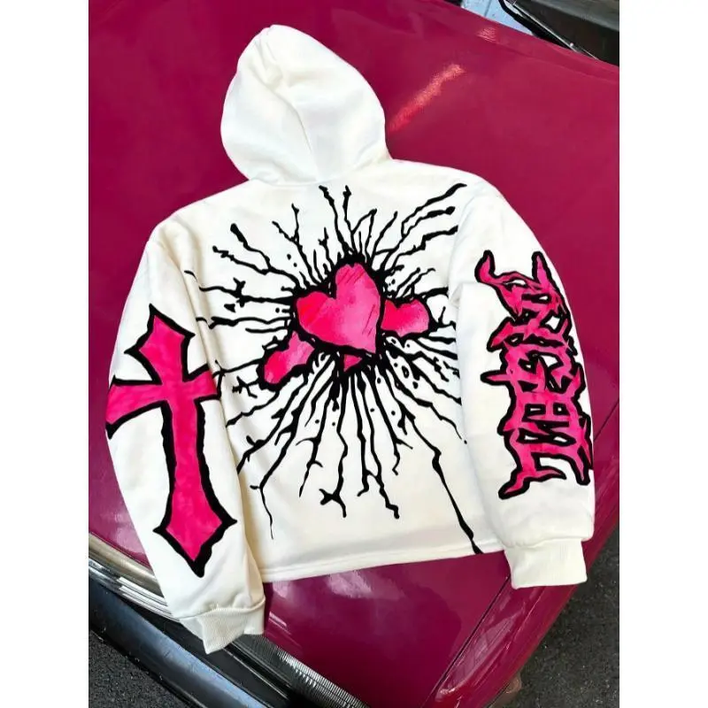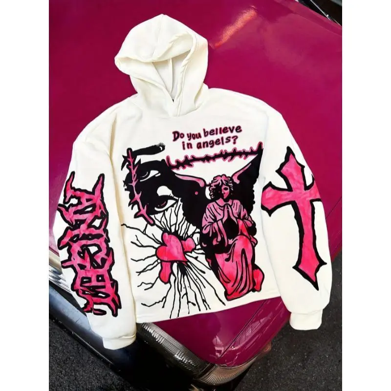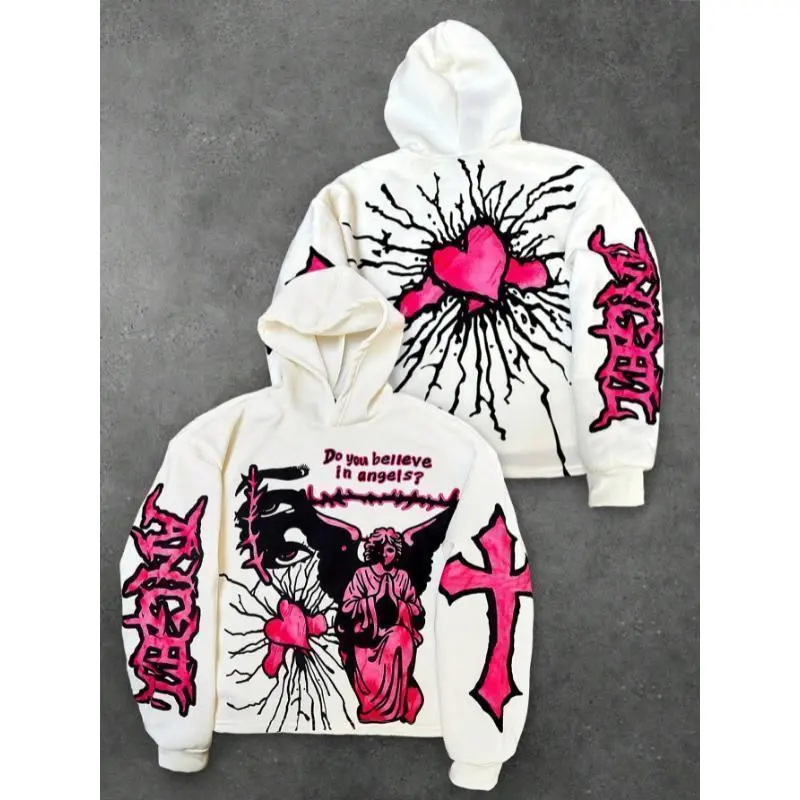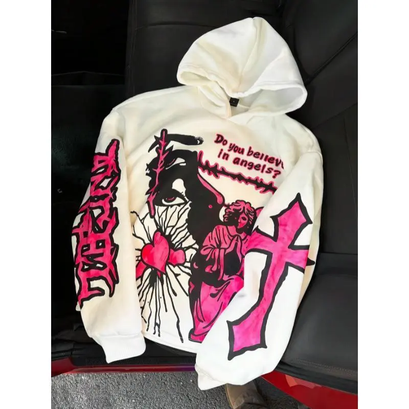 menswear Drippy.Men'S Street INS Pink Heart Angel Cross Gothic Font Short-Length Reversible Printed White Rapper Hoodie, Fall And Winter Graphic Going Out Street Wear Long Sleeve Hoodie, For Friends, Husband, Boyfriend Gift