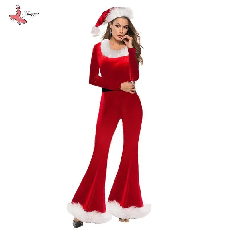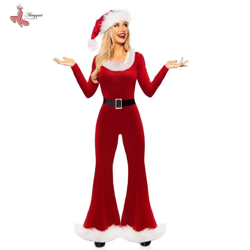 Women Christmas Costumes Cute Long Sleeve Flared Jumpsuit and Santa Hat Set for Cosplay Role-Playing Party Outfits