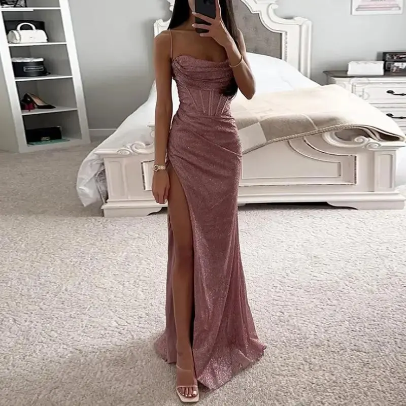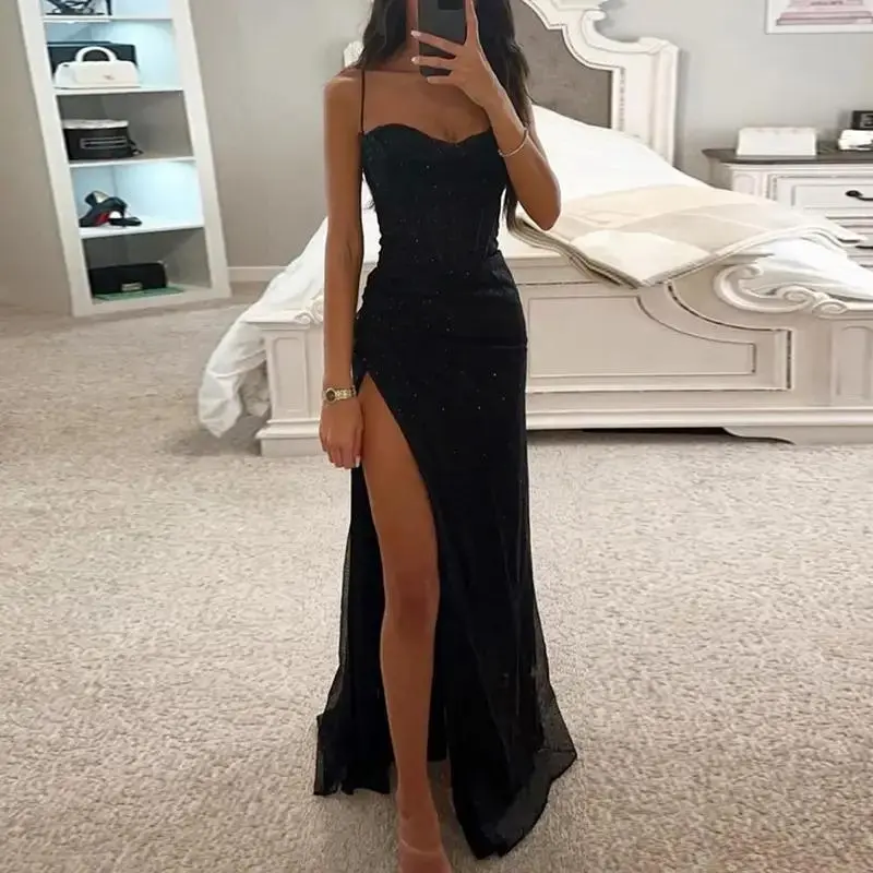 Versatile Party Dress Elegant Sequin Spaghetti Strap Evening Dress with Off Shoulder High Split for Women's Prom Floor LengthCasual Womenswear sundress white dress Blue Formal Workwear Comfort Basic Minimalist Sleeveless