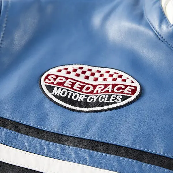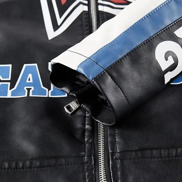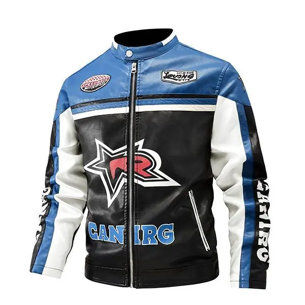 Blue Black White Colorblock Men's Racing Leather Jacket - Motorcycle Jacket with Racing Style Design & Streetwear Branding