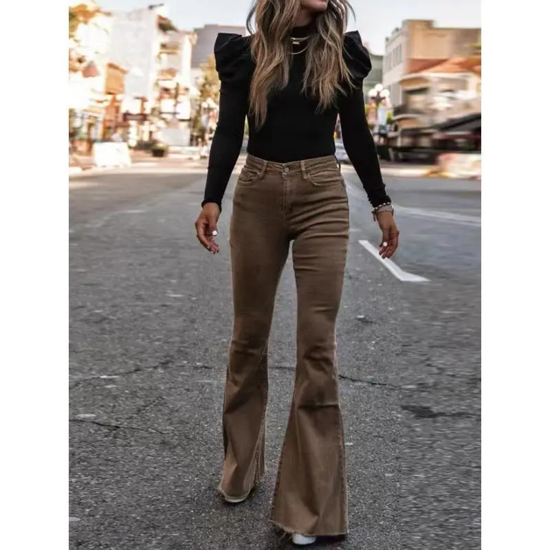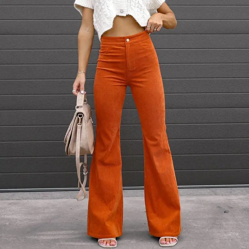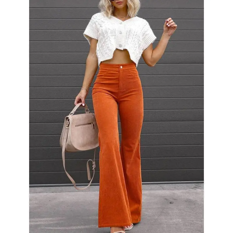 2025 Corduroy Trousers All Season Women Solid Button Fly Pocket Loungewear Slim Fit Ladies Flare Pants Streetwear Dropshipping