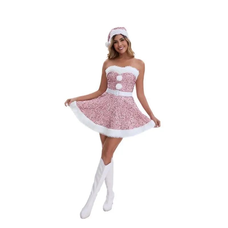 Christmas Costume Sexy Santa Dress Women Sparkling Strapless Mini Dress Red Sequin Mrs. Claus Outfit Festive Holiday Party Suit