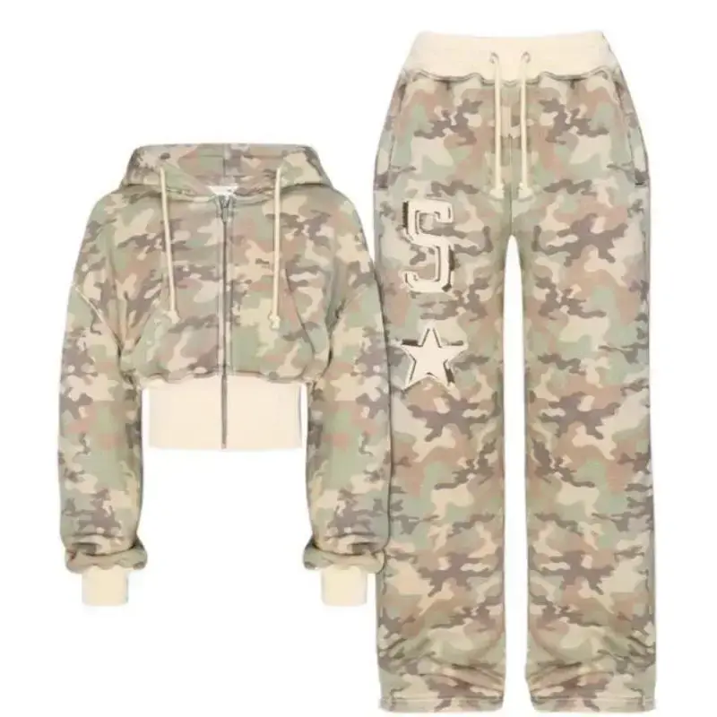 Fashion Sportswear Two Piece Suit Womens Hip Hop Pink Camouflage Short Waist Hugging Slim Hoodie Casual Loose Sports Pants