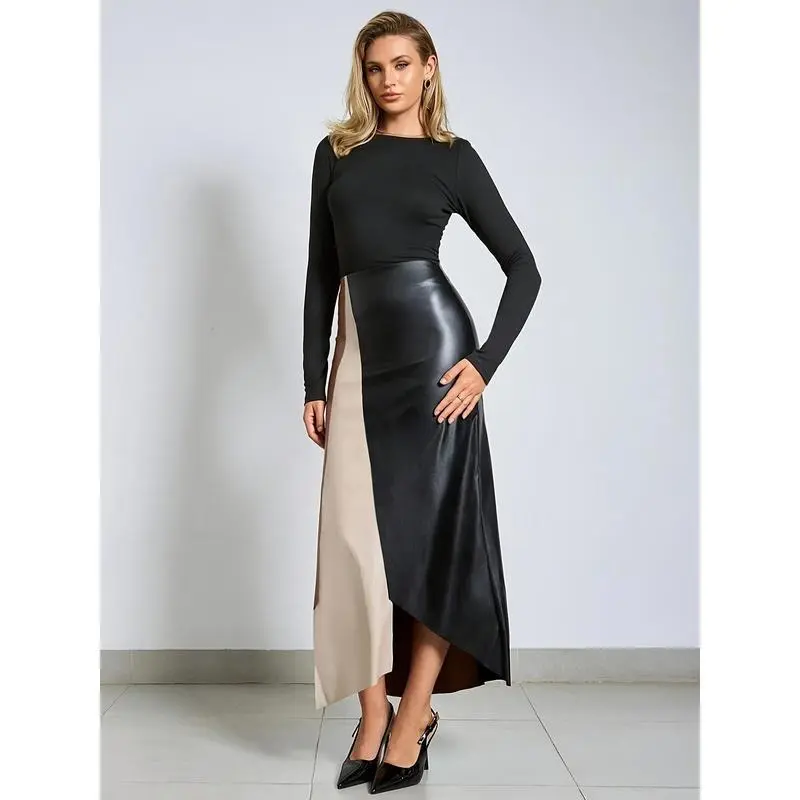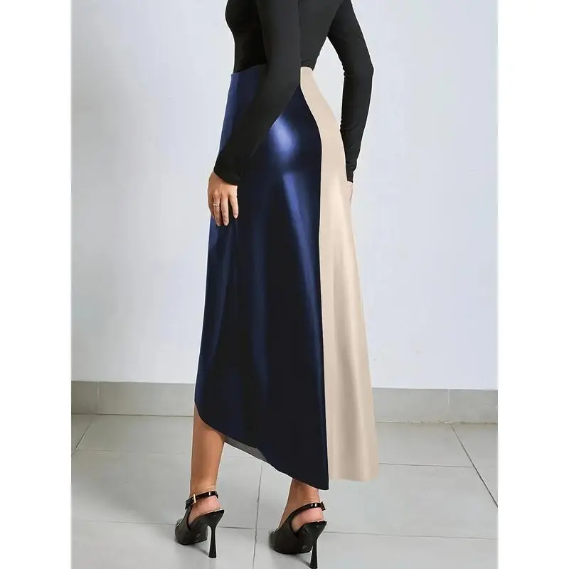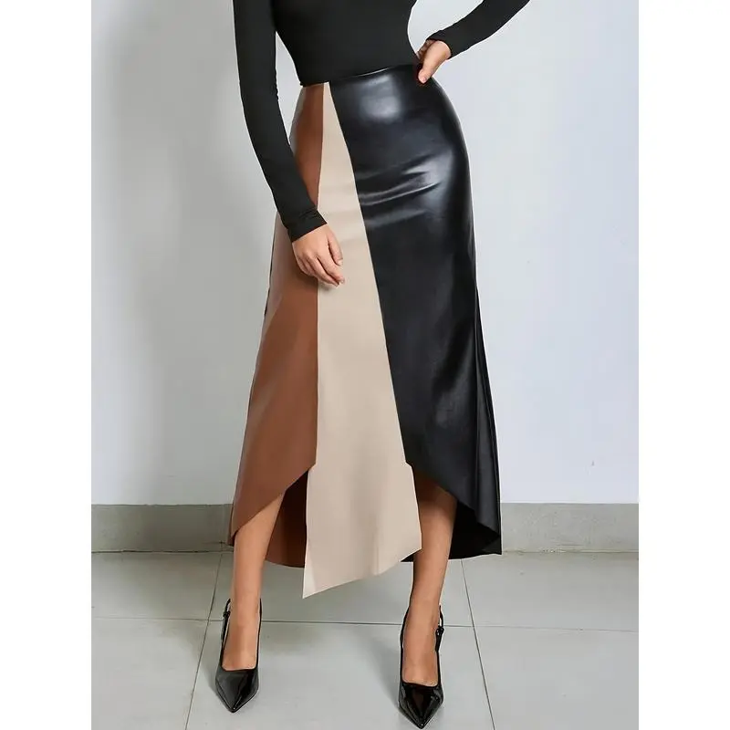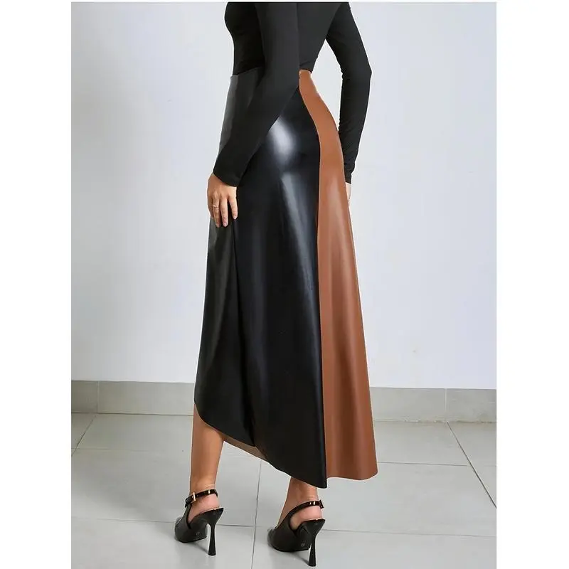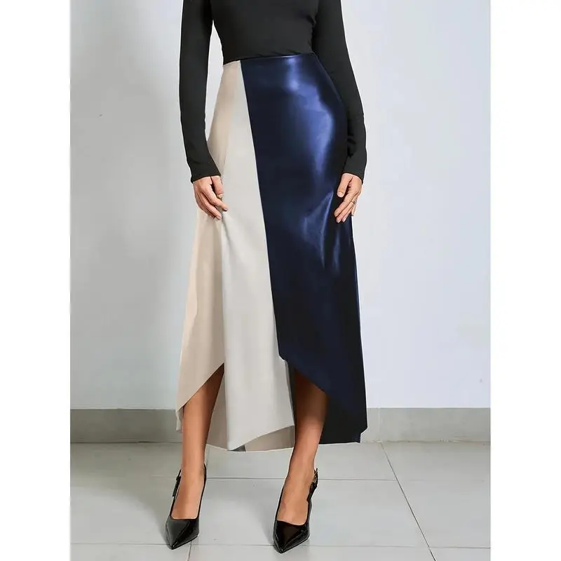 Elegant French-Inspired A-Line Midi Skirt for Women - Chic Black & Beige Two-Tone Design with High-Waisted Pleated Detail, Asymmetrical Hem, and Side Slit, Perfect for All Seasons, Versatile Fashion | Sophisticated Style | Quality Fabric