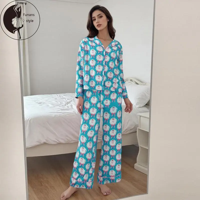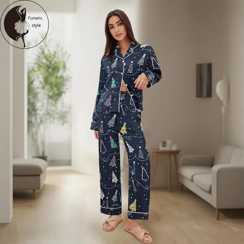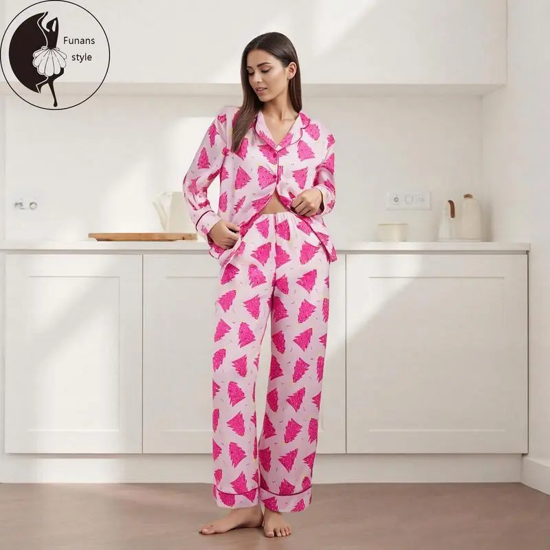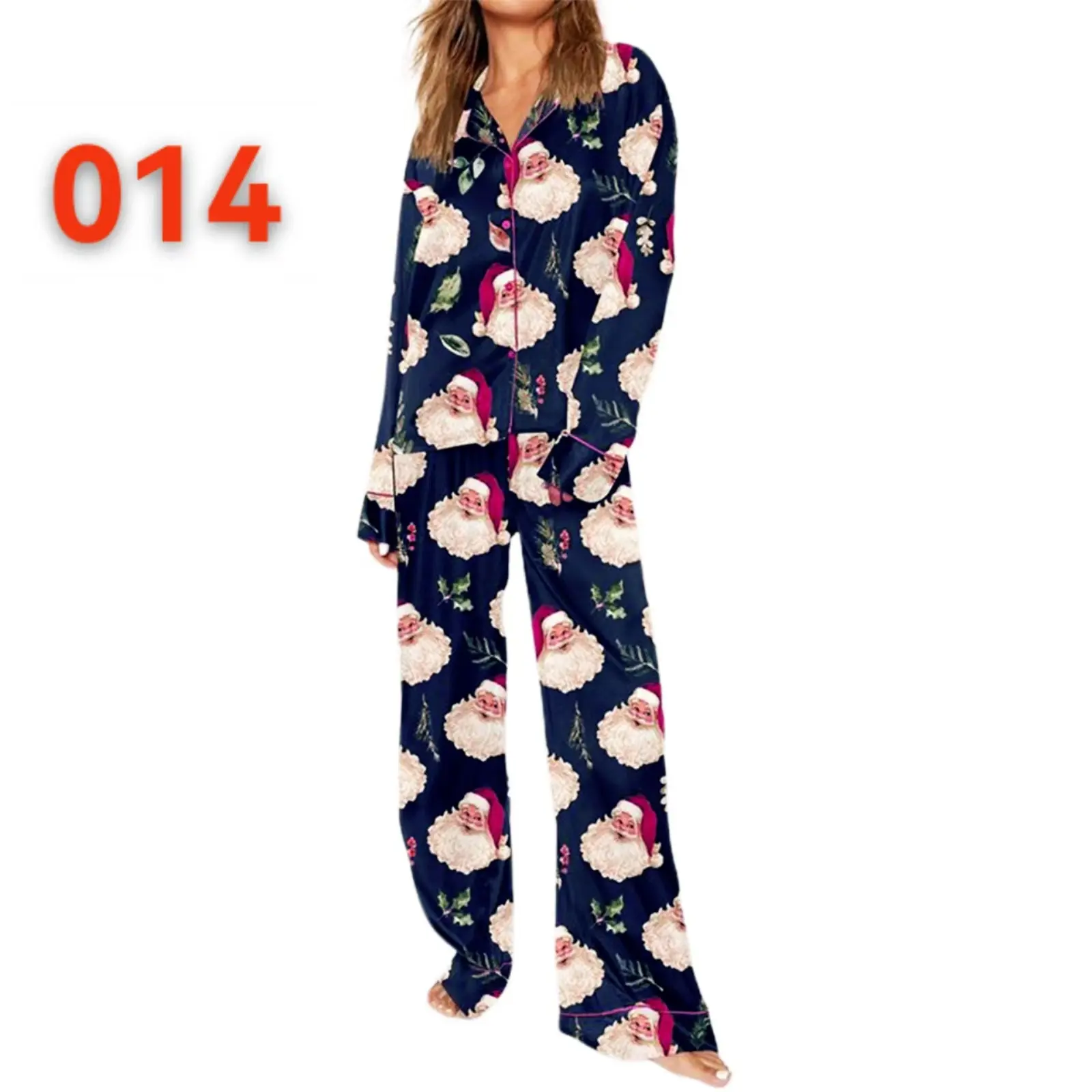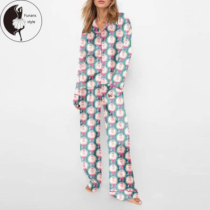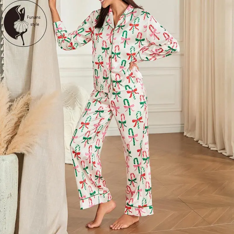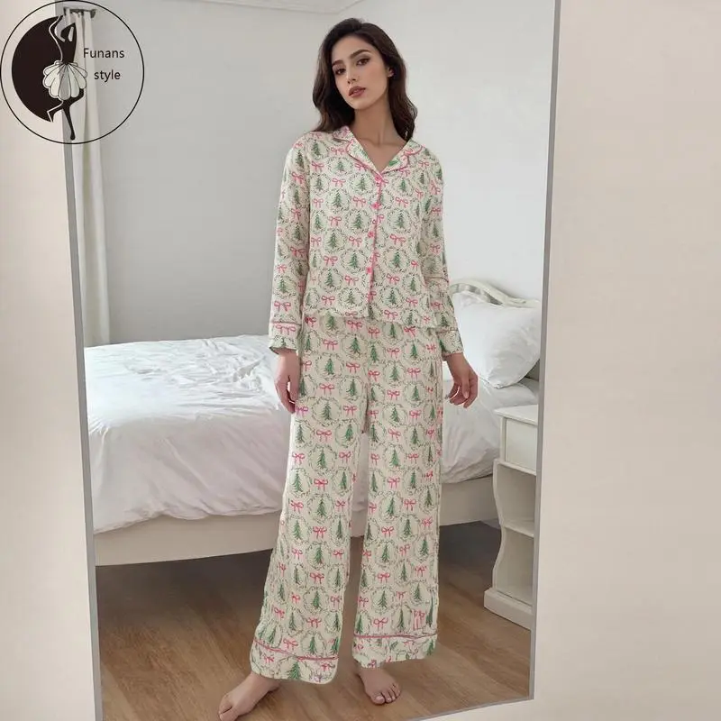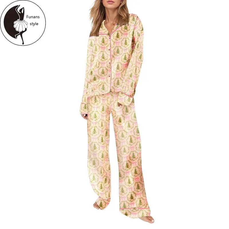 Women Christmas Pajamas Set 2 Pieces Loungewear Suits Bow/Santa/Tree Print Long Sleeve Shirts Tops and Pants Sleepwear Outfits