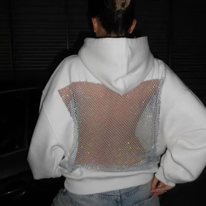 Women's Black Hoodie: Edgy Streetwear ✨ Open Back Design: This hoodie features an open back mesh cutout, adding an edgy touch to your outfit. Perfect for streetwear enthusiasts. 🌟 Casual Party Night 🎉 Ideal for Casual Outings: This hoodie offers comfort and style, making it a versatile piece for any occasion. It's suitable for casual outings and party nights. 🎉 Comfortable Relaxed Fit 🌟 Relaxed Fit: The relaxed fit ensures comfort throughout the day. It's a fashionable choice for those who prefer a comfortable yet trendy look. 🌟 🌸 Floral Womenswear Collection: This hoodie is part of the floral womenswear collection, making it a chic addition to your wardrobe. It's a trendy and stylish top. 🌸 Material and Fit