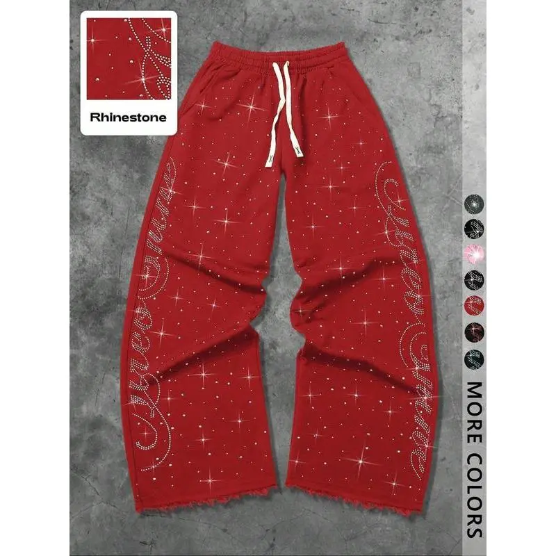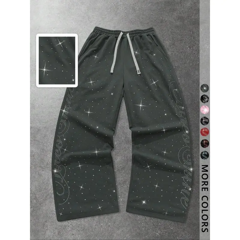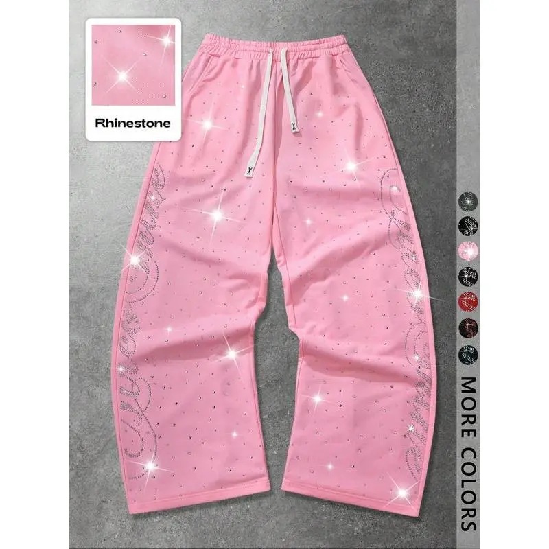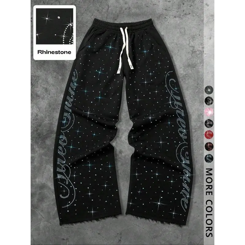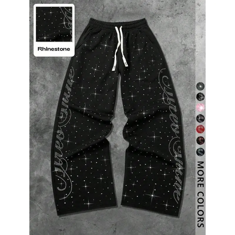 Unisex Street Style Rhinestone Hip-Hop Sweatpants, Long Sport Pants for Casual, Y2K Fashion, Gym Wear, Outdoor School