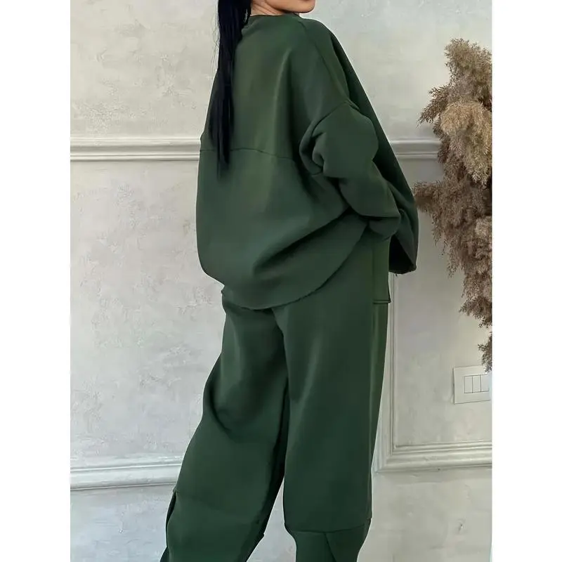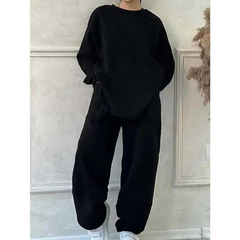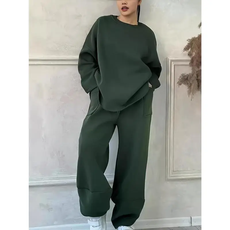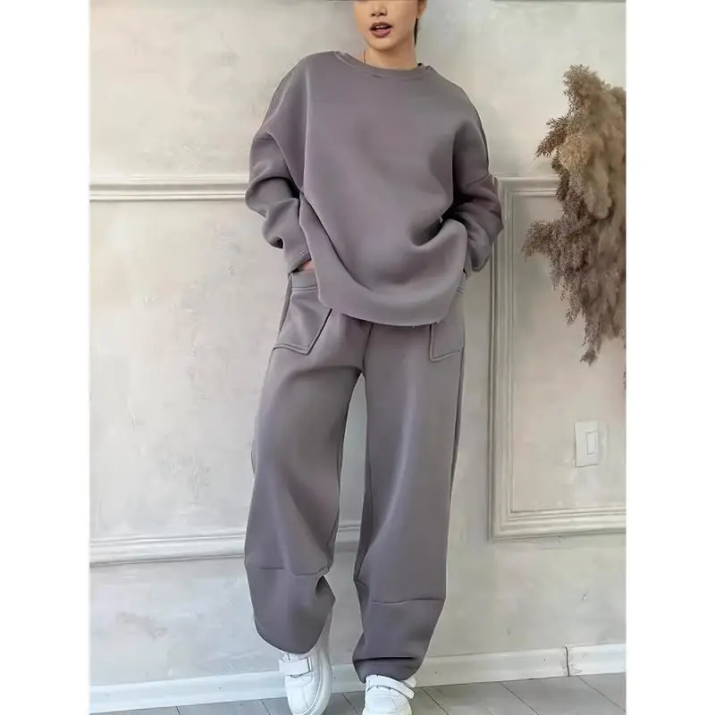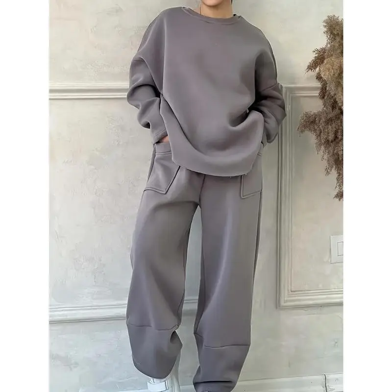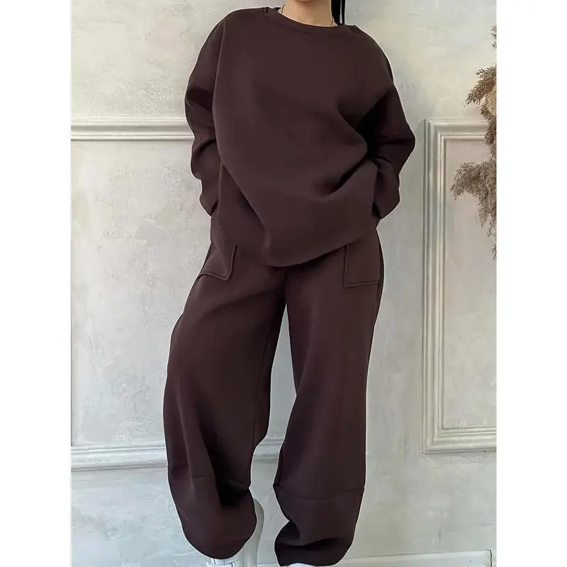 Women's Plus Size Oversized Oversuit Set - Oversized Wide-Leg Jogger Pants & Oversized Sweater-Like Top (No Collar) - Brown/Beige Solid Color, Loose Fit Winter Warmth, Machine Washable Casual & Dressy Outfits