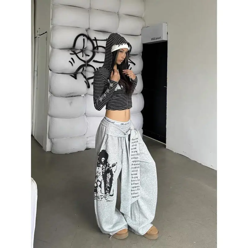 ZHIZOU Women Gray Gothic Baggy Y2k Letter Print Pants Harajuku 2000s Vintage Oversize Sweatpants Wide Leg Trousers Autumn 2025