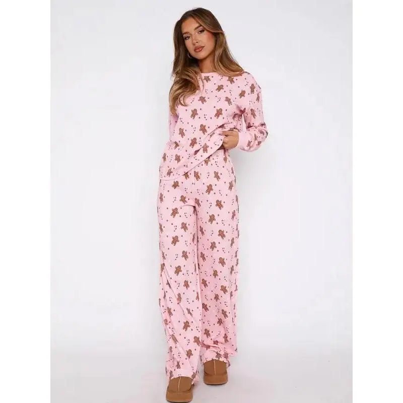 Christmas Women‘s Outfits Casual Gingerbread Print Long Sleeve Tops and Elastic Pants 2 Piece Set Streetwear