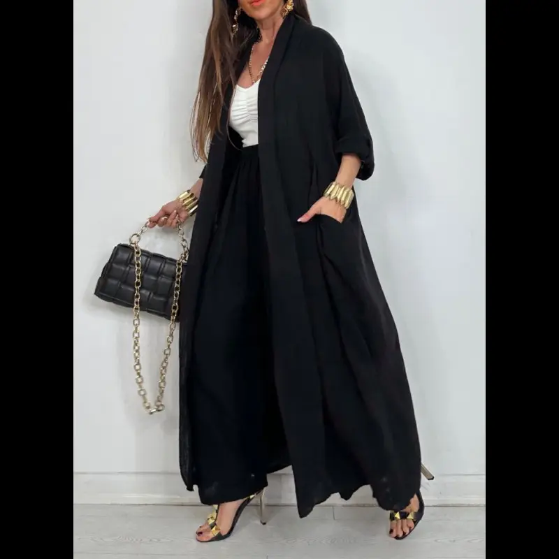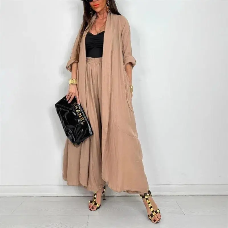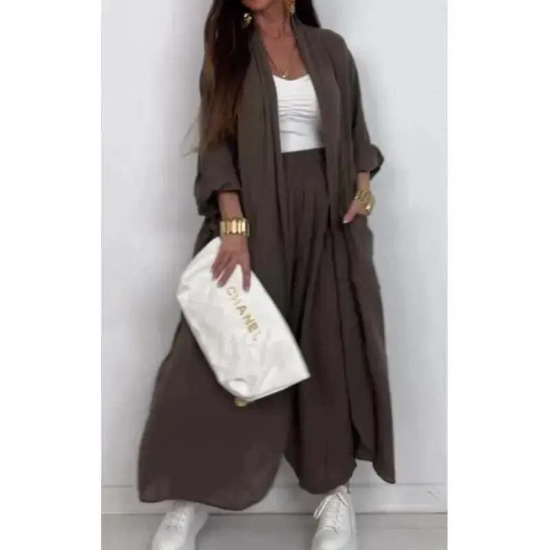 ??Solid Lazy Style 2-Piece Set/Elevate your wardrobe with this elegant two-piece set!The cardigan long sleeve shirt pairs perfectly with wide leg pants, creating a chic look.Available in black, blue, light brown, and dark brown, this set suits various styles.Choose from sizes S to XXXL for a perfect fit.Ideal for plus-size women, this outfit offers versatility and comfort./??Size Options/This set comes in multiple sizes: S, M, L, XL, XXL, and XXXL.Find your ideal fit easily with these size options.The set is designed to accommodate a range of body types, ensuring comfort and style for all.Match your size preference based on the provided chart for the best results./??Color Choices/Select your favorite color from the available options: black, blue, light brown, and dark brown. These solid colors add a touch of sophistication to your outfit. The set is versatile, making it easy to match with other pieces in your collection. Choose the color that complements your style.