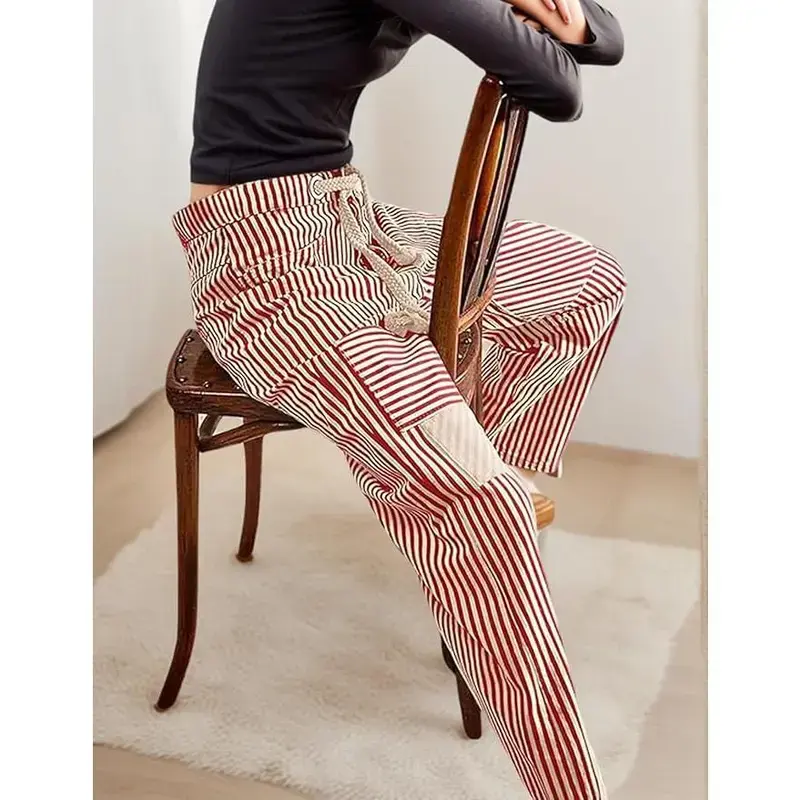 Barrel Jeans for Women Striped Drawstring Patchwork Pants Wide Leg Boyfriend Denim Pants