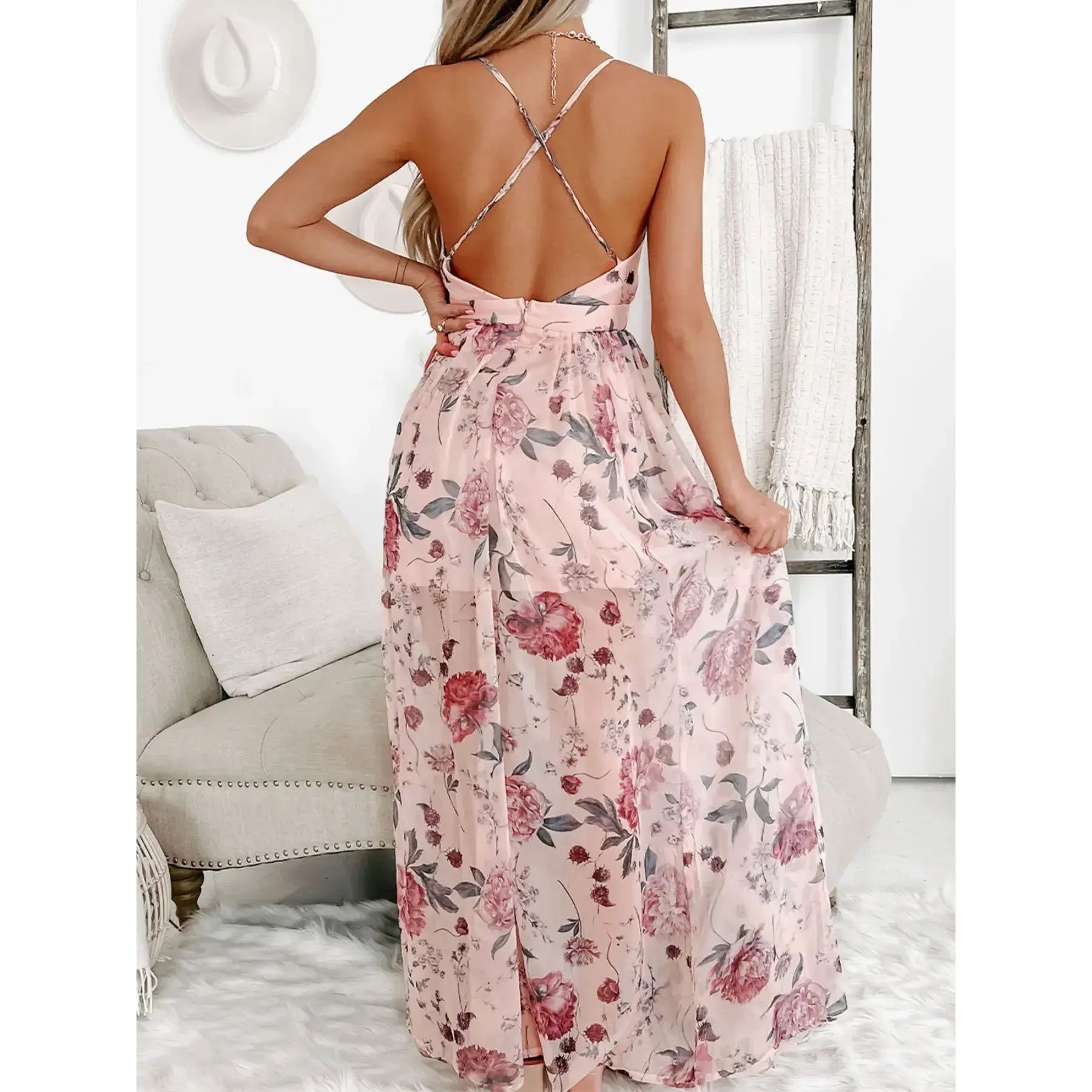 【Flower Print】: Features a charming floral pattern, adding a vibrant touch that distinguishes this dress for special occasions. 【Backless Style】: The attractive backless design showcases a flattering silhouette, enhancing appeal for summer events and weddings. 【Deep V-Neck】: The deep V-neckline offers a bold statement, striking a balance between feminine allure and contemporary fashion. 【Ruched Detailing】: Incorporates elegant ruched detailing that enhances the dress structure while providing a distinct visual texture. 【High Waist Cut】: Designed with a high waist cut, it creates an elongated look that pairs beautifully with various body shapes.