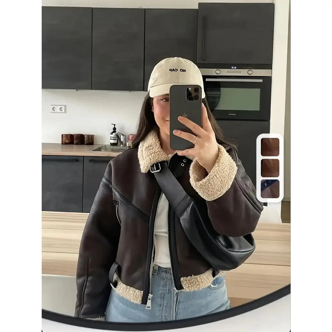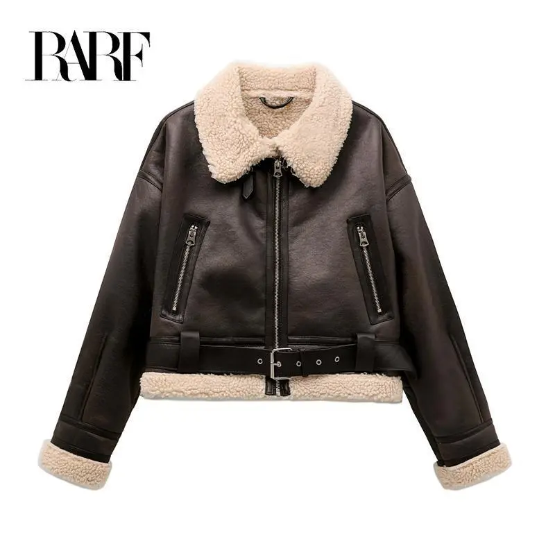 RARF 2024 New Woman's Fashion Thick Warm Faux Shearling Jacket Coat Vintage Long Sleeve Belt Hem Female Outerw Womenswear Tops Outerwear Casual Brown puffer jacket winter clothes women winter coats women