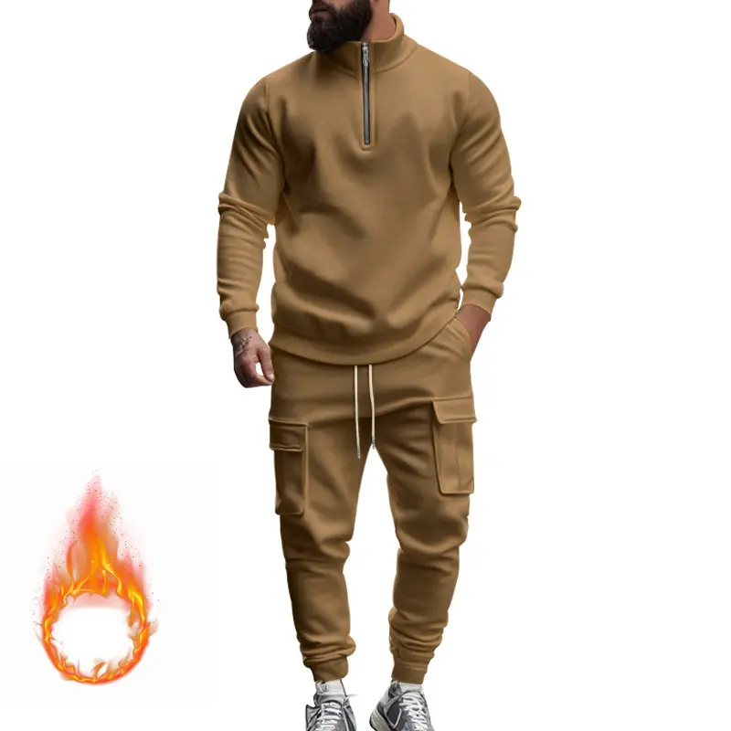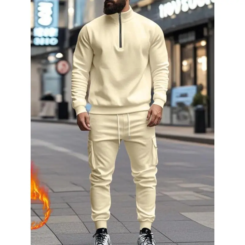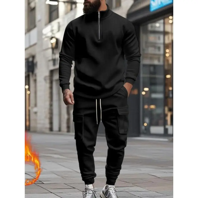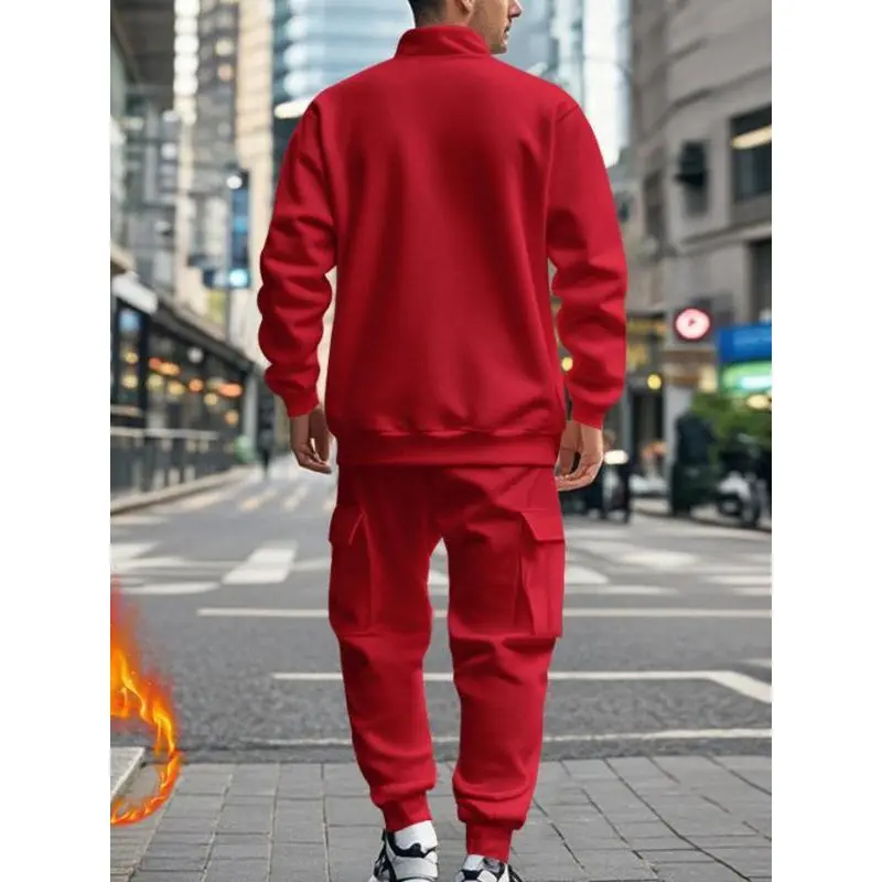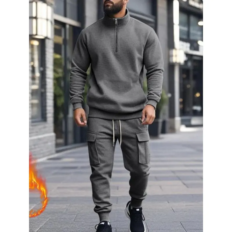 Men's Casual Fleece Lined Zipper Work Pants Set, Thick Knit Fabric Warm Long Trousers for Fall & Winter, New Arrival Us Style