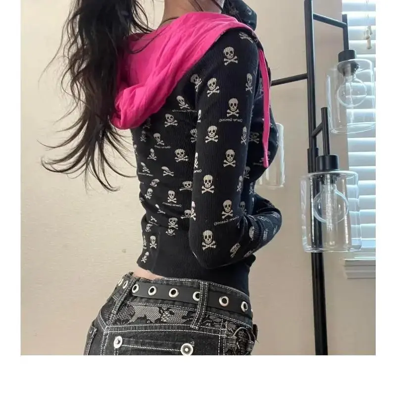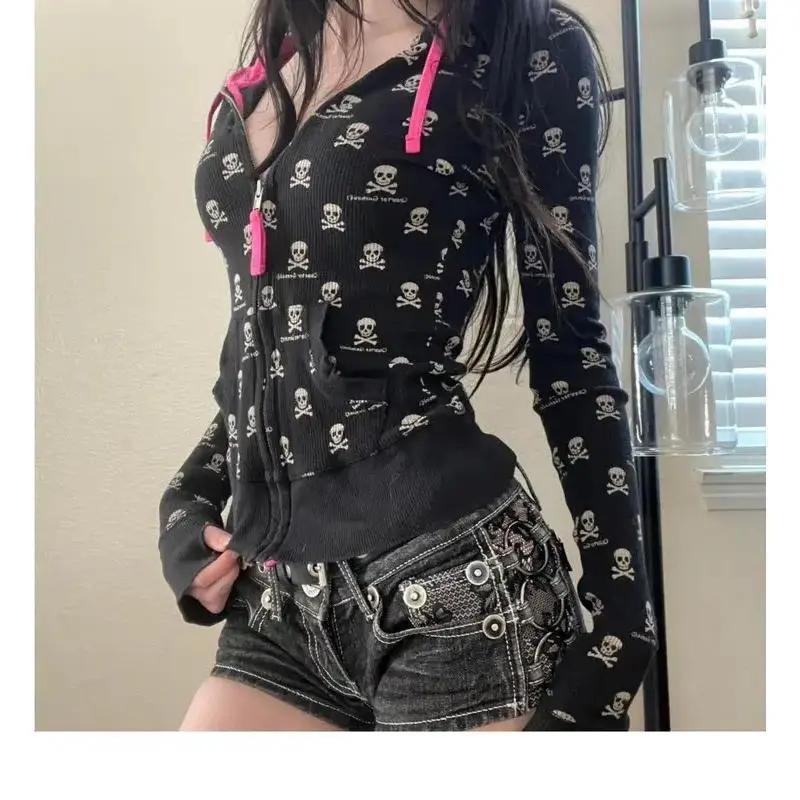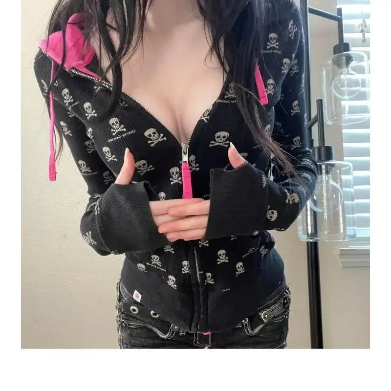 Hoodies Y2k Clothes Skull Punk Hot Girl Slim Zip-up Hooded Coat Gothic 2000s Streetwear Woman Top Outdoor Hoody Harajuku Vintage