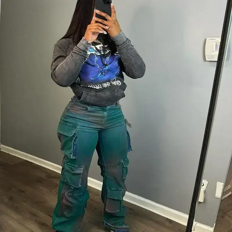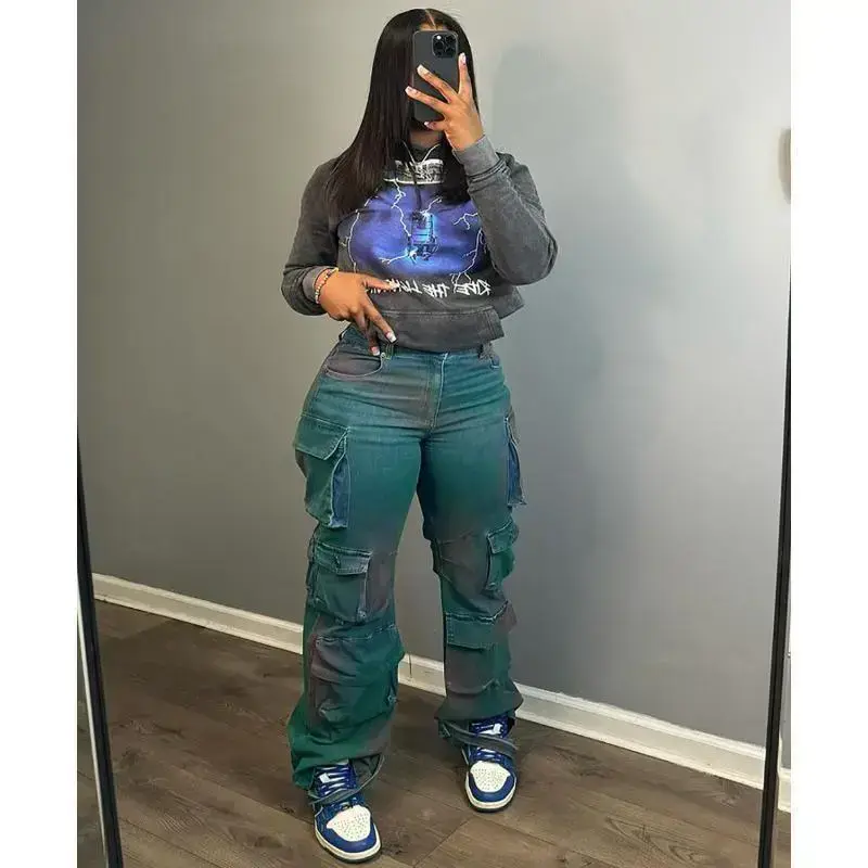 2025 New Women's Fashion Personality Trend Multi-pocket Tie-dye Jeans High-waist Straight-leg Pants Denim Green Bottoms Fabric Can be used with a raincoat