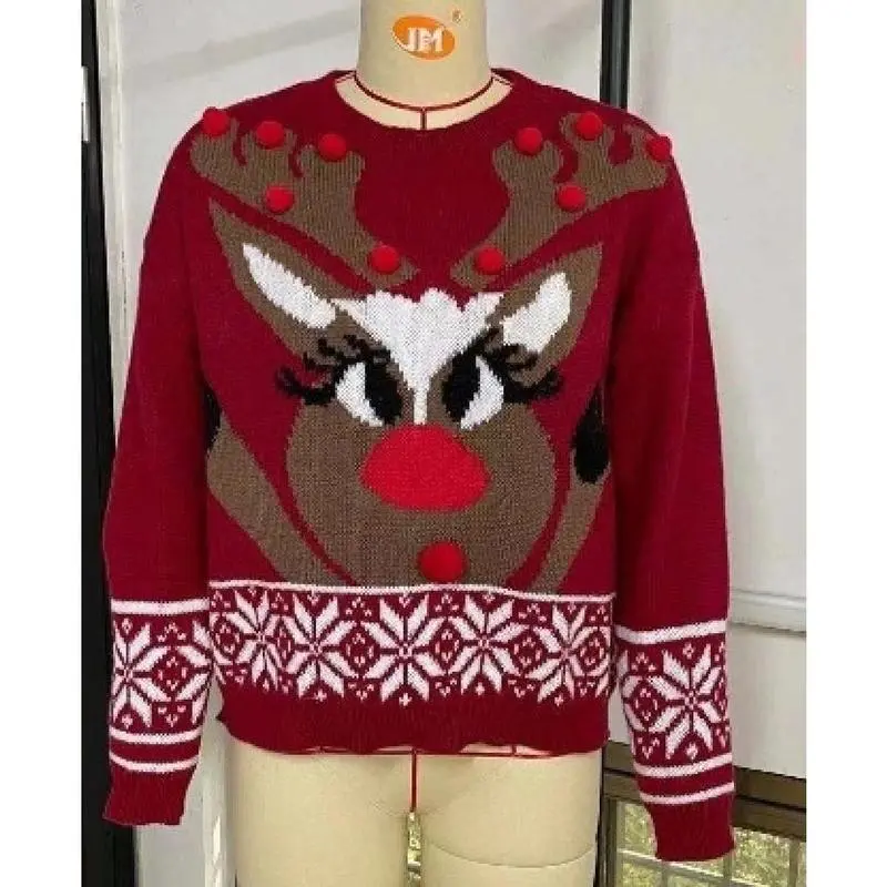 Women's Christmas Reindeer Sweater Red with 3D Pom-Pom Accents Crew Neck Long Sleeve Pullover Unique Festive Knit Top for Christmas Parties Ugly Sweater Contests & Holiday Gatherings Knitwear Womenswear Fits Soft Vibe Winter Fabric