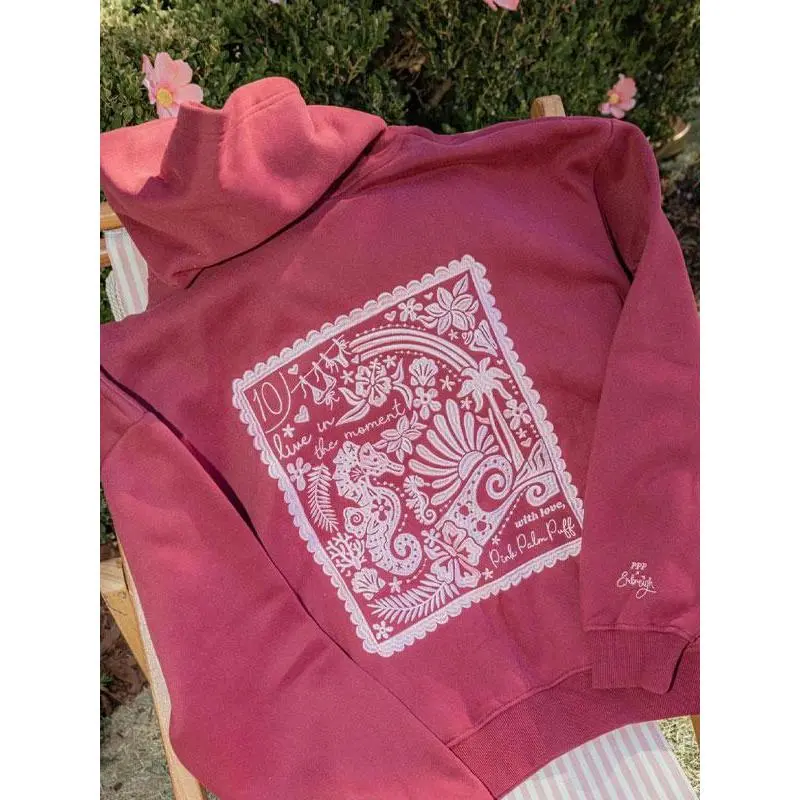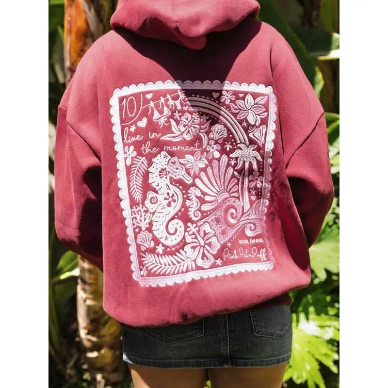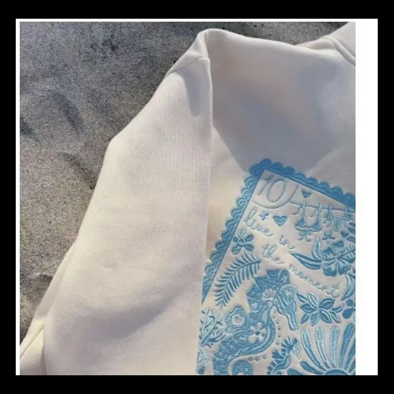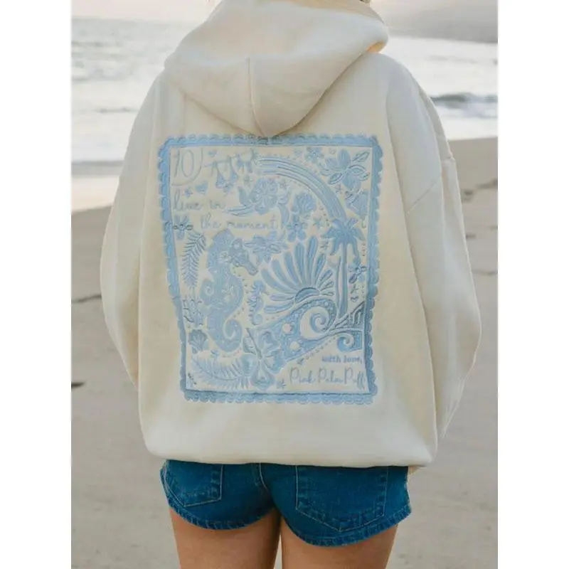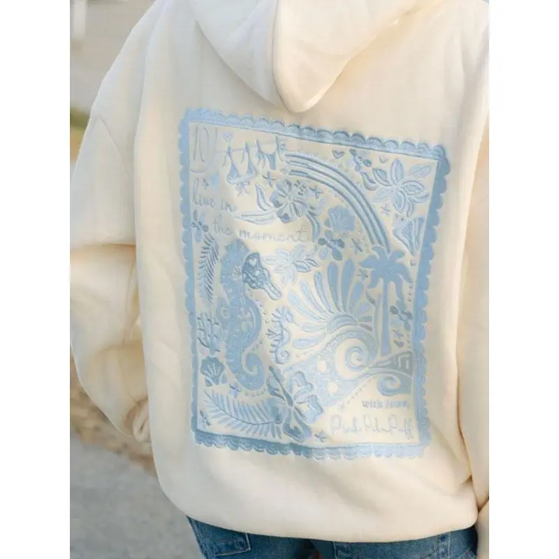 Women`s crew neck sea horse embroided hoodie, fashion comfort casual drop shoulder hooded sweatshirt for daily outdoor wear, casual clothes & halloween clothes, winter & fall outfits, downtown girl clothes