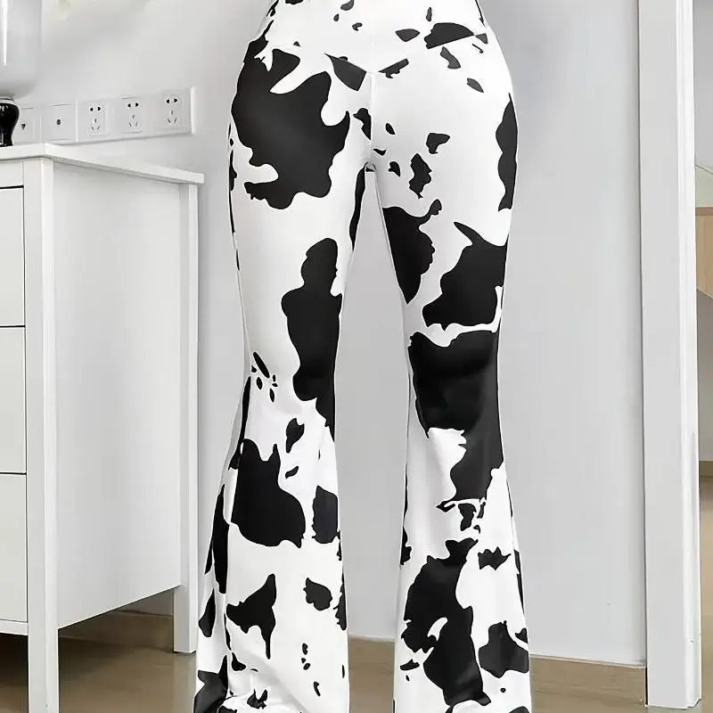 Women's Cow Print Skinny Flare Leg Pants - Elegant Everyday Wear - Stretchy & Comfortable Fabric - Ideal for Casual & Trendy Outfits - Perfect Gift for Fashionable Women - Black & White Animal Print Bottoms