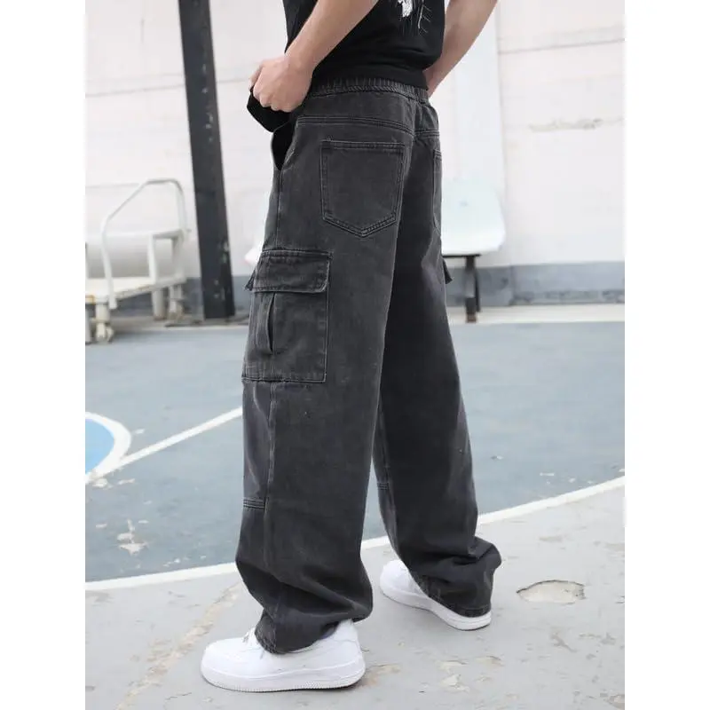 Mens Baggy Cargo Jeans Wide Leg Hip Hop Jeans Streetwear Loose Fit Denim Pants