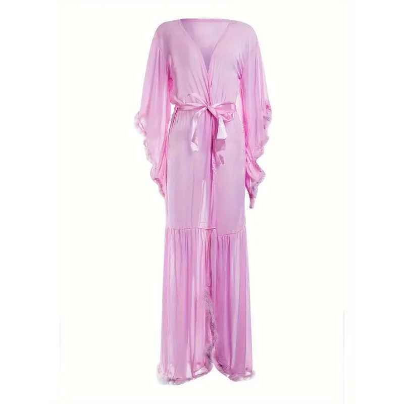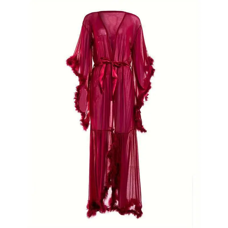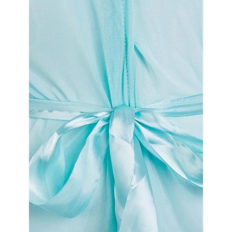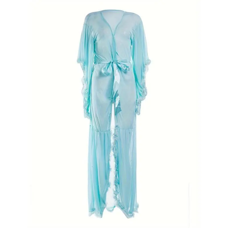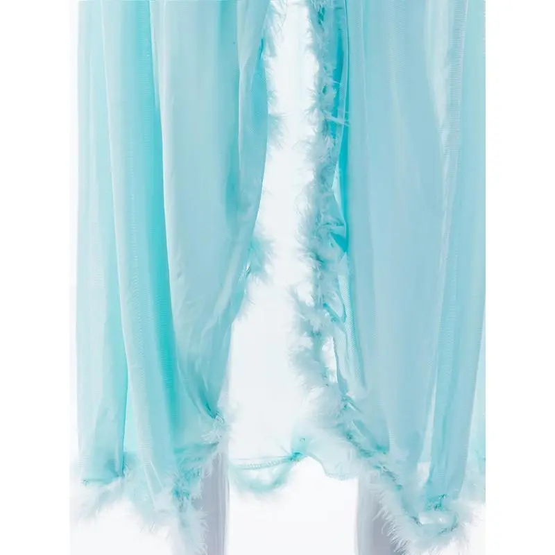 Light Blue Transparent Plush Kimono Robe - Long Ruffled Hem Babydoll Pajamas, Sexy & Comfy Sleepwear for Women Lace Womenswear Gowns Loungewear Can be used with a raincoat