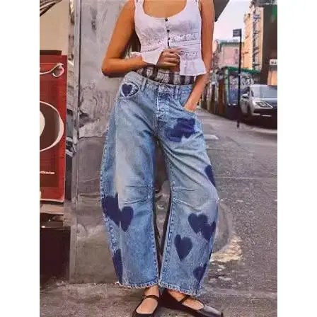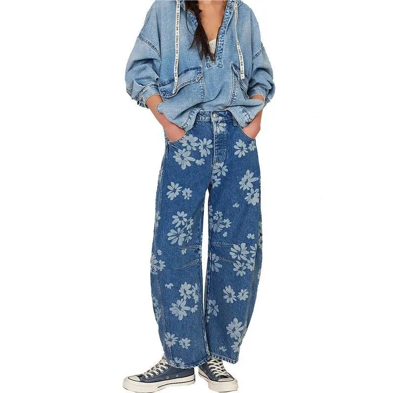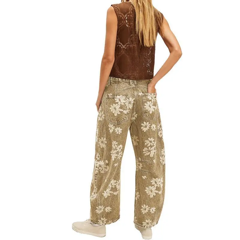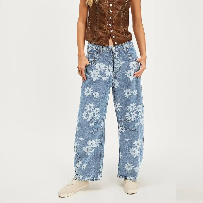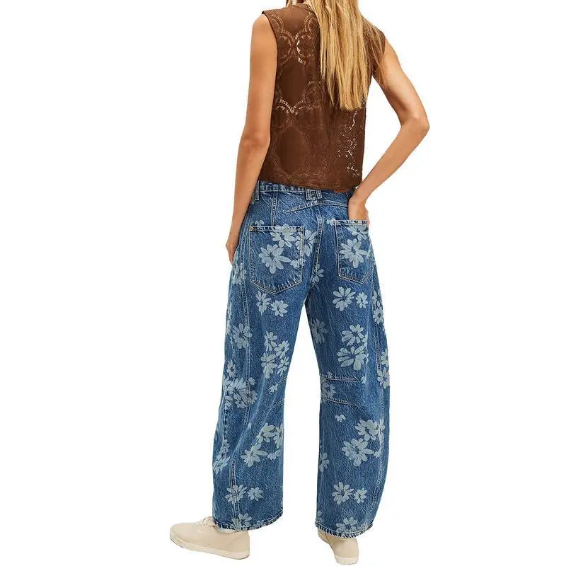 Women Y2k Distressed Barrel Jeans Baggy Wide Leg Jeans Floral Printed Boyfriend Patchwork Denim Pants