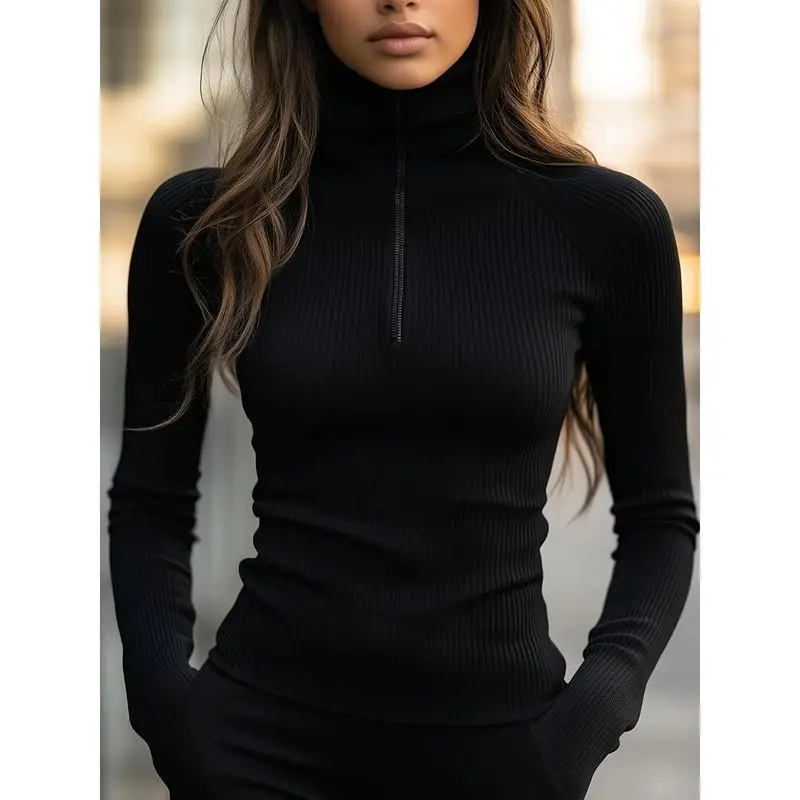 Women's High Neck Zip-Front Top, Stretch Long Sleeve Shirt for Fall Winter, Casual Formal Wear