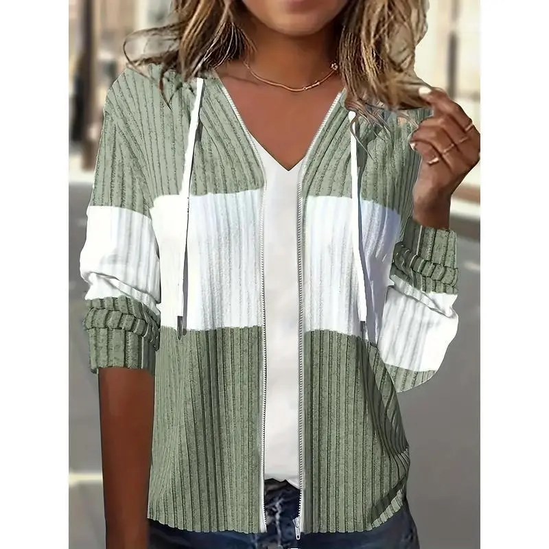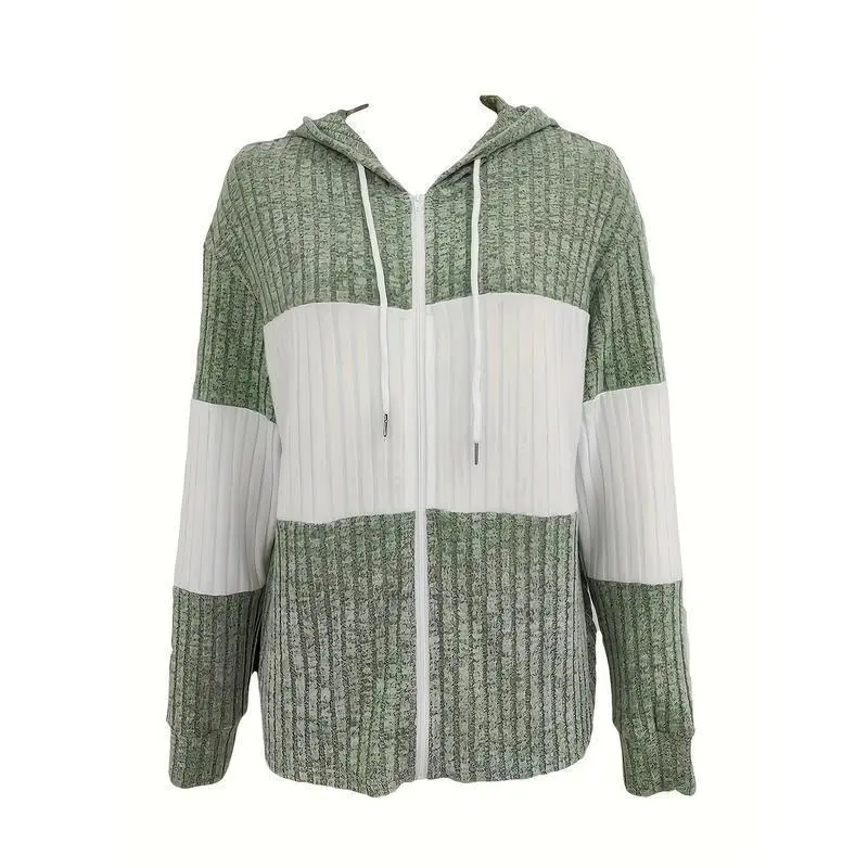 Color Block Zip Up Drawstring Hoodie, Casual Long Sleeve Rib Knit Sweatshirt, Women's Clothing