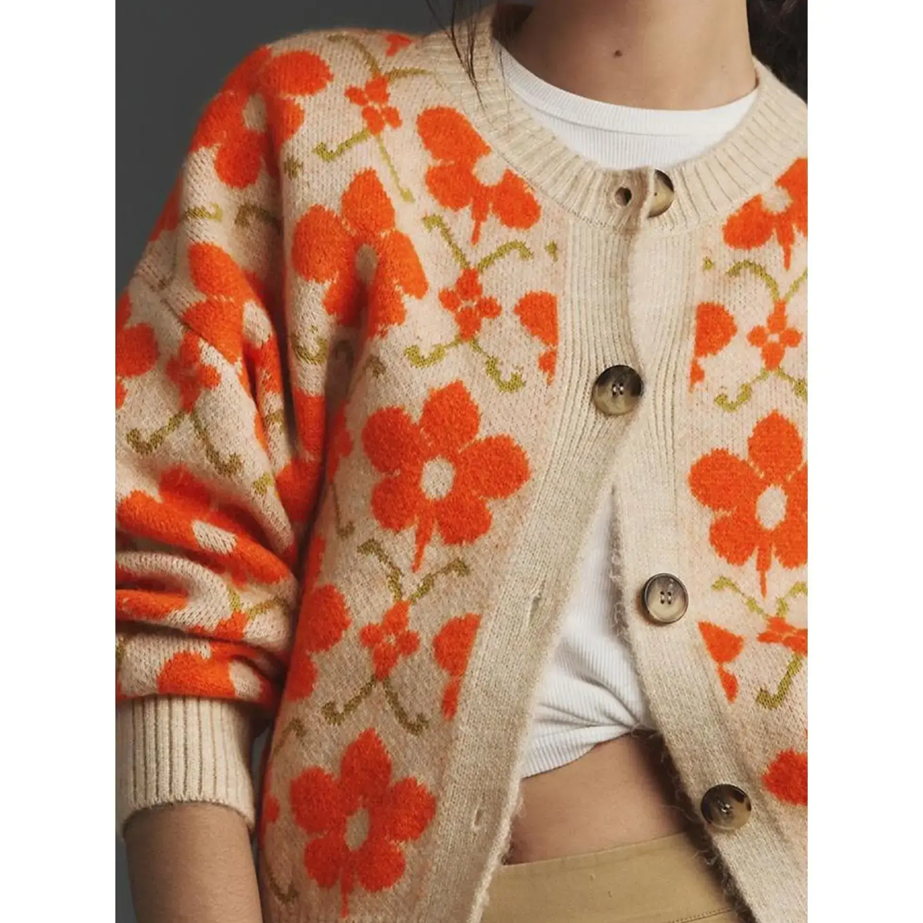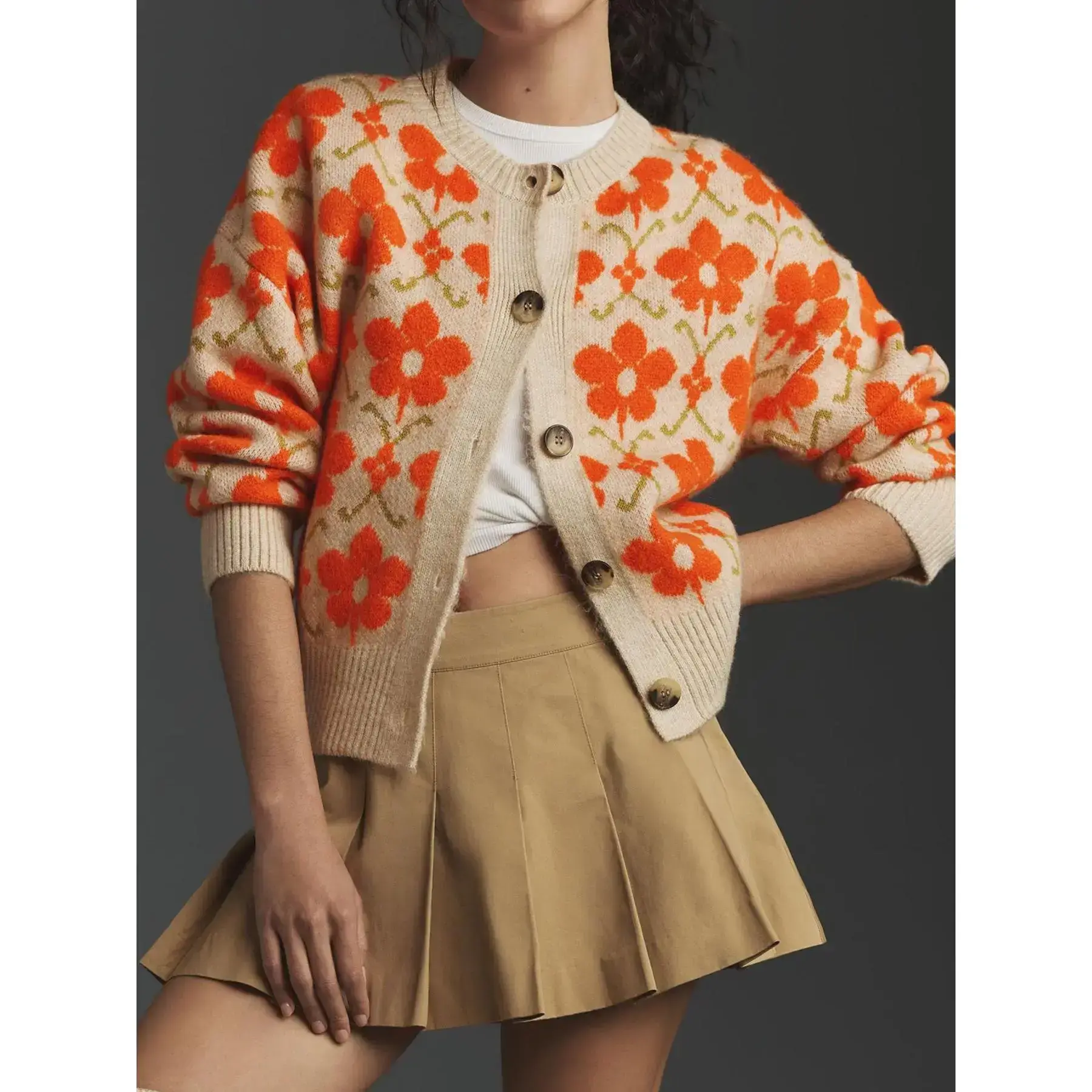 Women's Beige Floral Print Cardigan, Round Neck Button Front Long Sleeve Knitted Sweater, Vintage Patterned Cropped Outerwear for Fall Winter