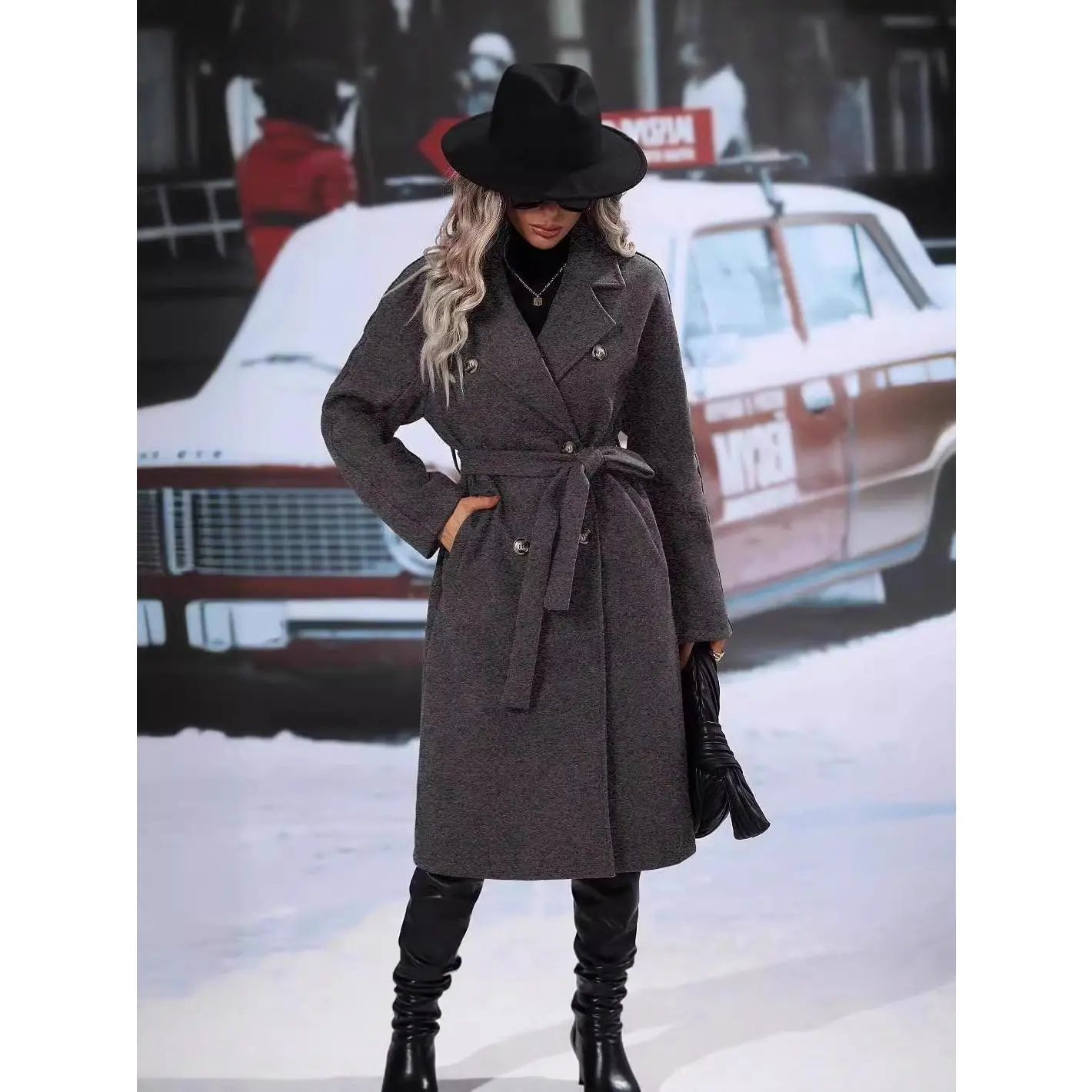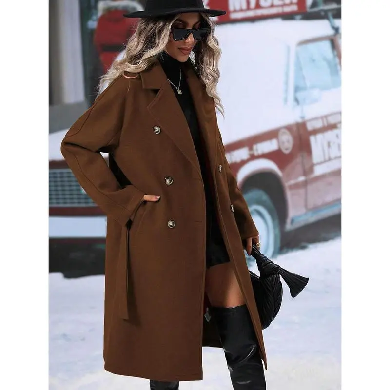 Womens Long Wool Pea Coat Notched Lapel Double Breasted Trench Coat Winter Warm Overcoat with Belt Womenswear Jackets