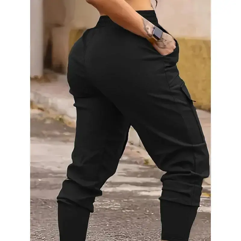 Women's High-Elastic Jogger Cargo Pants with Covered Pockets, Drawstring Waist - Stretchy Outdoor Sports and Casual Wear Banded Bottom Sweatpants