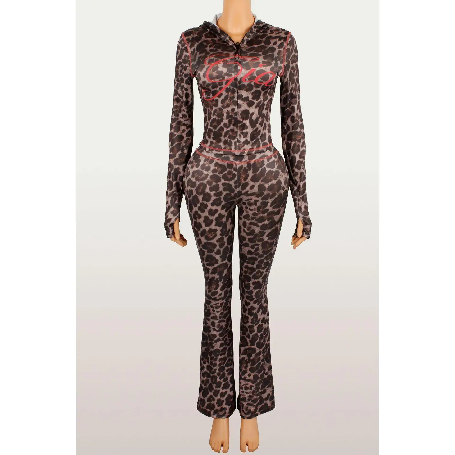 Women's Fall 2025 Leopard Print Zipper Long Sleeve Jacket and Pants Set Polyester Spandex Comfortable Leisure Suit for Street Casual Wear