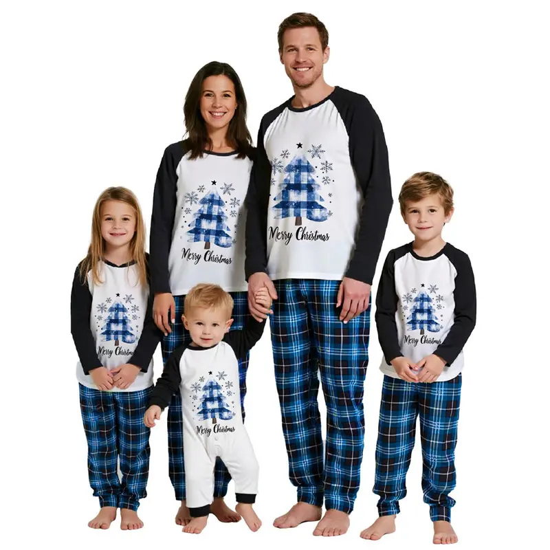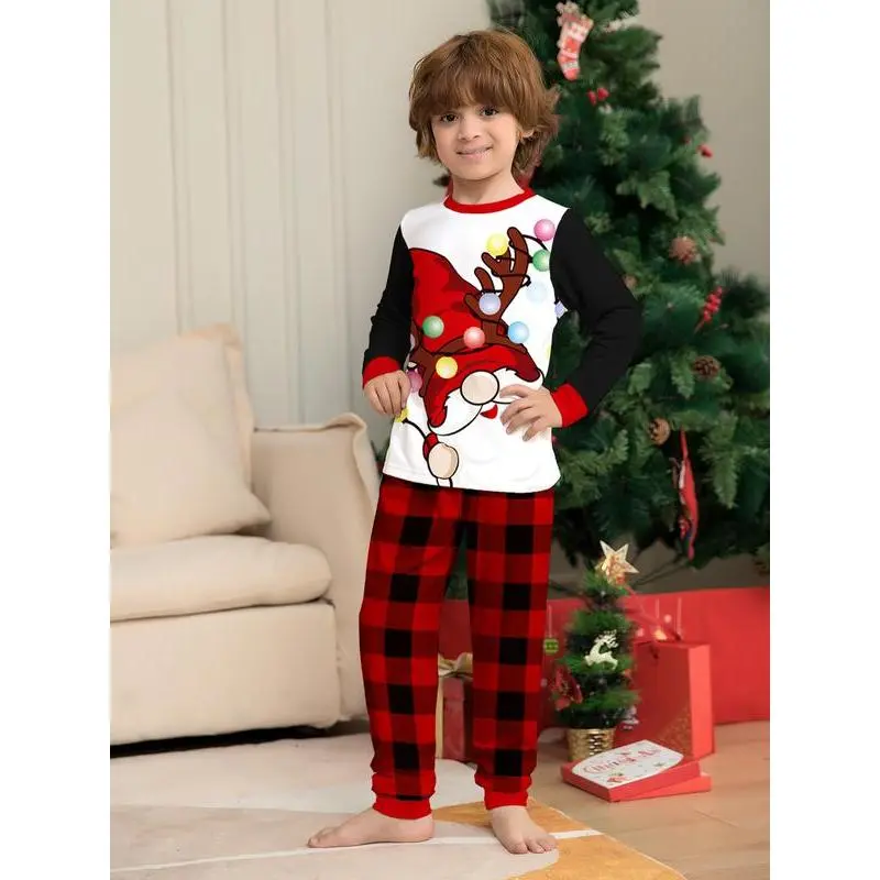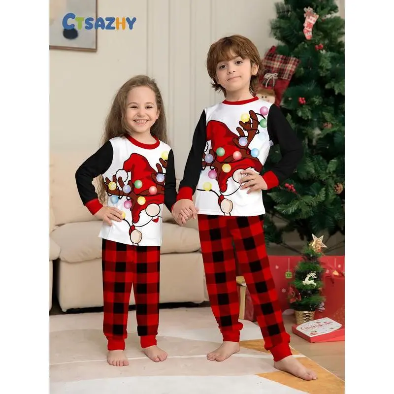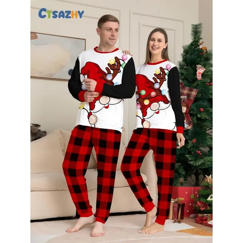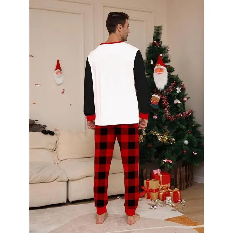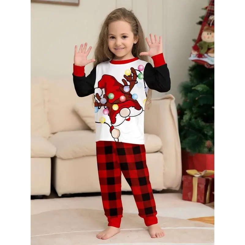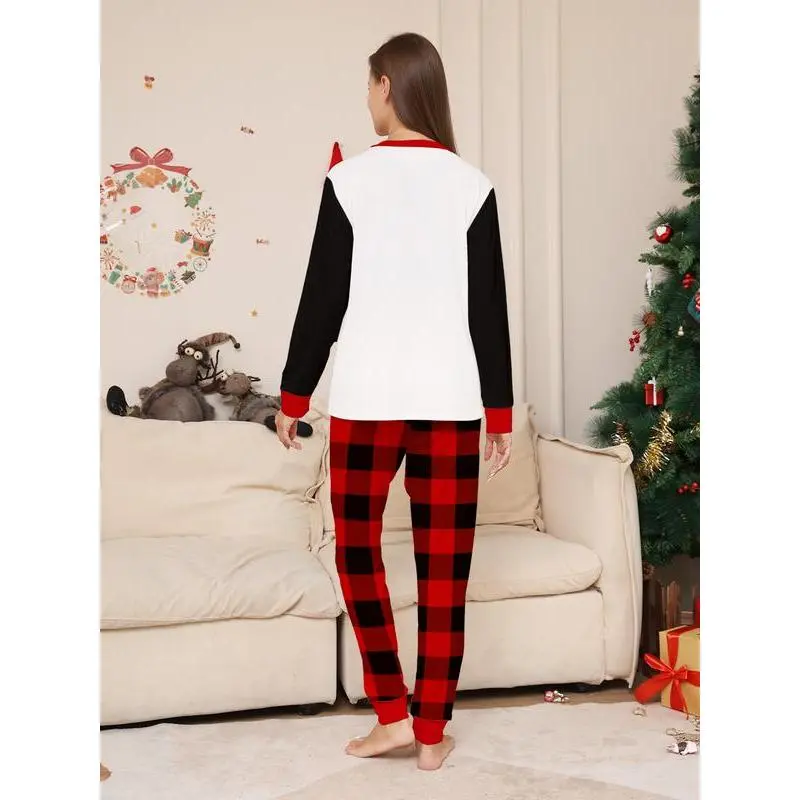 【Festive Design】: Featuring a playful Christmas-themed print, including Santa and reindeer lights, it embraces the holiday spirit. 【Family Coordination】: Available for both adults and children, promoting matching outfits for family gatherings and celebrations. 【Soft Material】: Crafted from stretchy, skin-friendly fabric, ensuring comfortable wear without feeling stuffy or cold during autumn-winter. 【Quality Details】: Includes black and white raglan sleeves paired with red and black plaid pants for an appealing visual contrast. 【Cozy Fit】: Fitted silhouette that provides warmth while allowing ease of movement for lounging at home or bedtime.