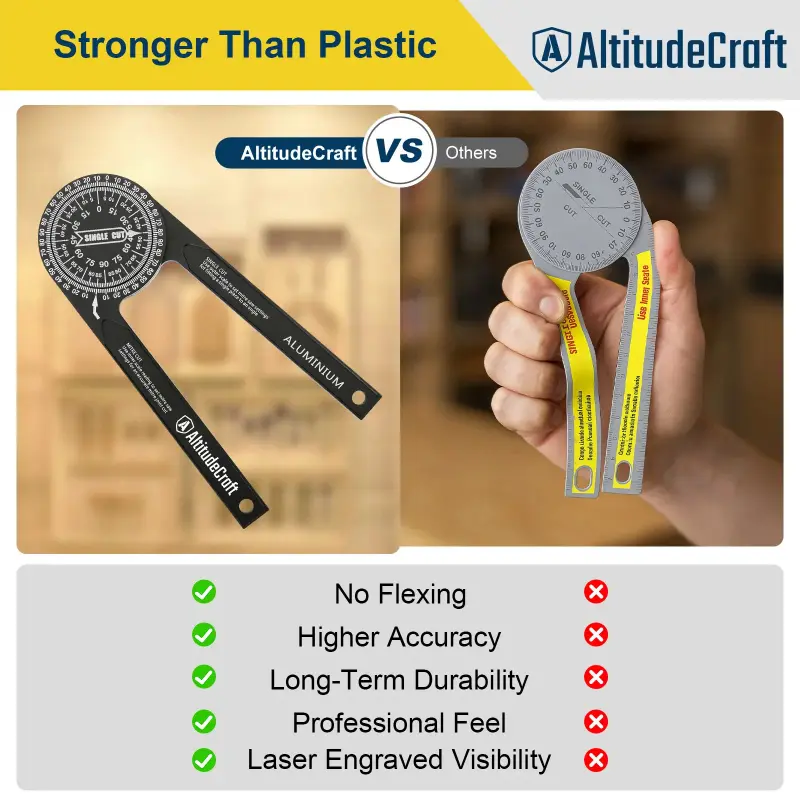 Upgrade your angle-measuring precision with the AltitudeCraft Aluminum Miter Saw Protractor, an essential tool for accurate miter and bevel cuts in woodworking, carpentry, and metalworking.Built for durability and engineered for smooth, exact measurements, this 7.28-inch angle finder helps professionals and DIYers get it right the first time.
