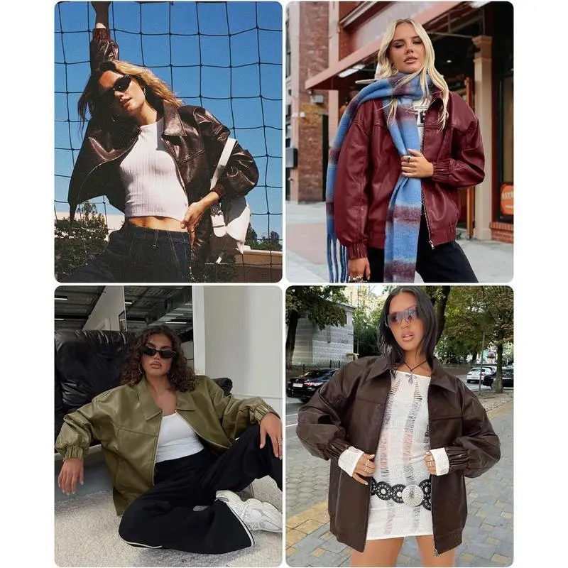 Womens Leather Jacket Oversized Faux Casual Zip Up Bomber Motorcycle Jackect Trendy Fall Winter Clothes S-XXL
