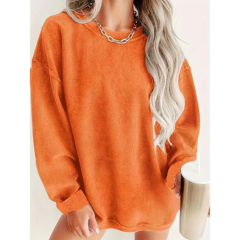Corduroy Long Sleeve Crew Neck Solid Color Pullover Sweatshirt - Soft Micro Elasticity, Regular Length, Casual Style for Spring & Fall - Womens Comfortable Woven Crew Neck Sweater for Everyday Wear