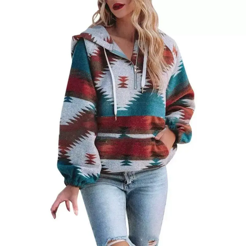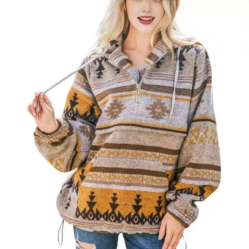 Material: Polyester.Super cozy, comfy and warm to wear.Suitable for spring, fall and winter Features: Zipper up, drawstring hood, elastic cuffs, full sleeves, and a kangaroo pocket, loose fit, western ethnic pullover for women, featuring contrast color splicing print design, comfy and stylish Occasion: Perfect for casual, party, club, indoor, outdoor, home, school,family together, Christmas, festival, etc.Easy to match with all kinds of tops, jeans, leggings, and create an daily look Style: Casual long sleeve pullover top, boho sweatshirt hoodies, ethnic zip up hooded sweat, zipper v neck hoodies, suitable for ladies, juniors, teens, and girls Size: Please check the size chart in the last picture before placing an order, if you are not sure of your size, please contact us in time