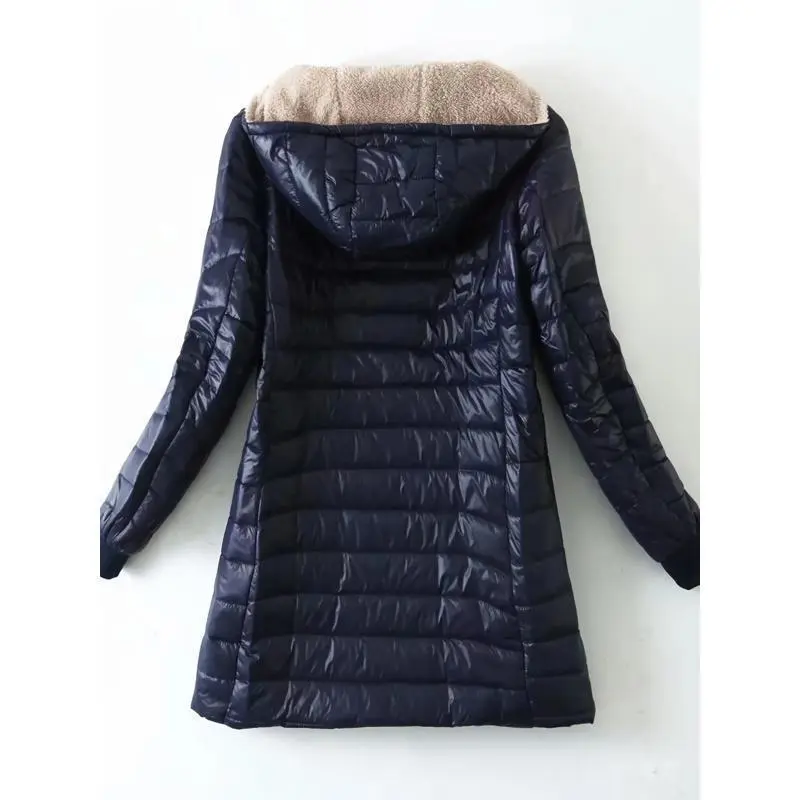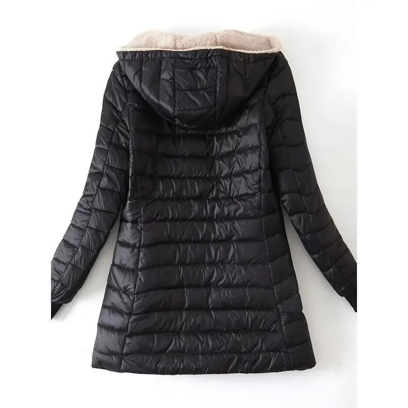 Women's Elegant Fleece Thickened Hooded Mid-Length Coat - Slim Fit Zipper Winter Overcoat, Machine Washable Black Cold-Proof Outerwear, Suitable for Cold Weather Long Sleeve Polyester Plus Size Puffer Fabric Women's Wear Medium Printed Elegance Jackets