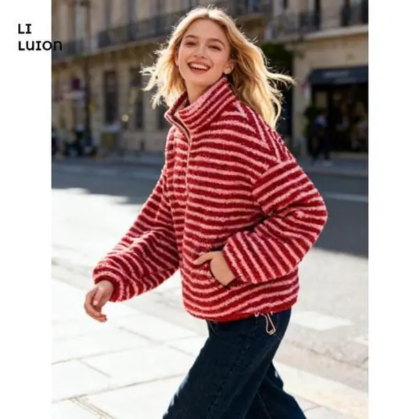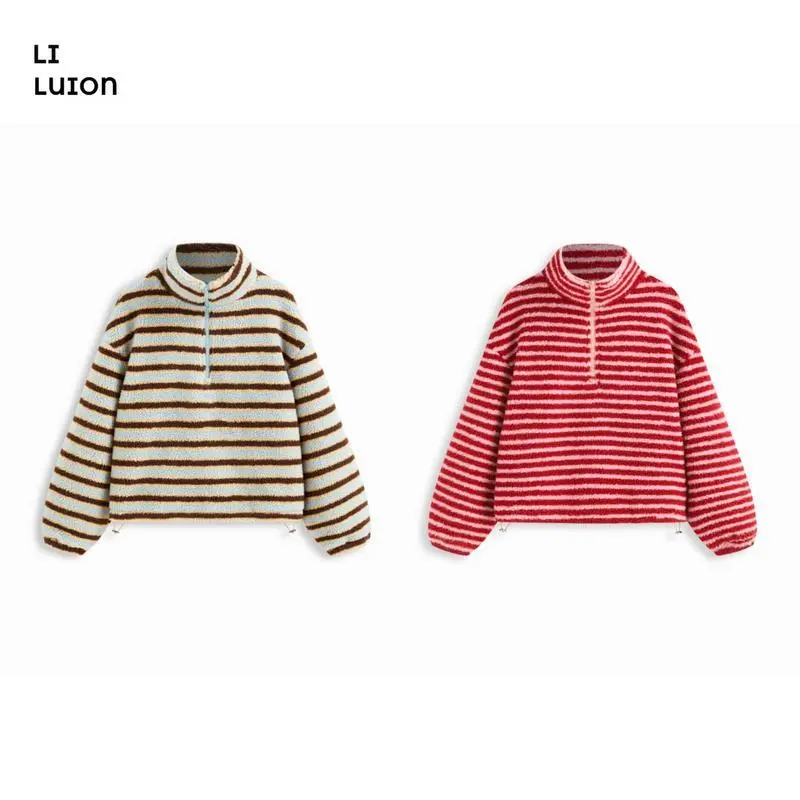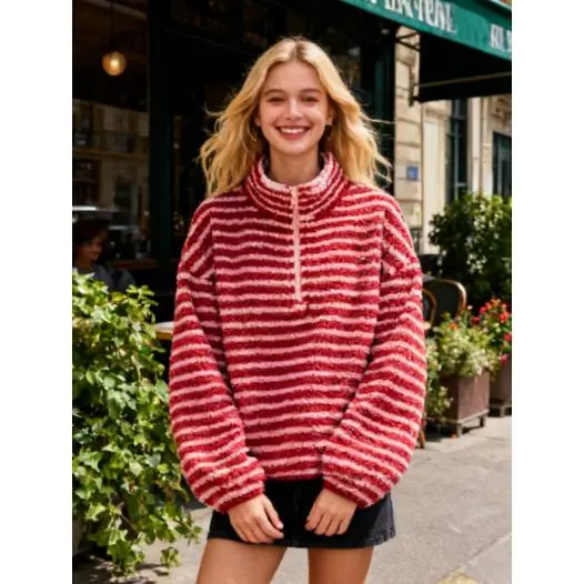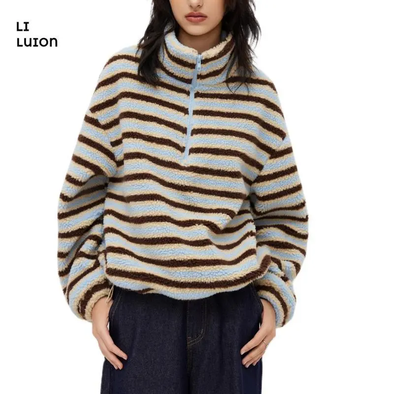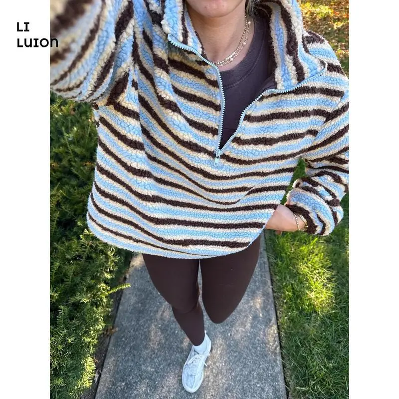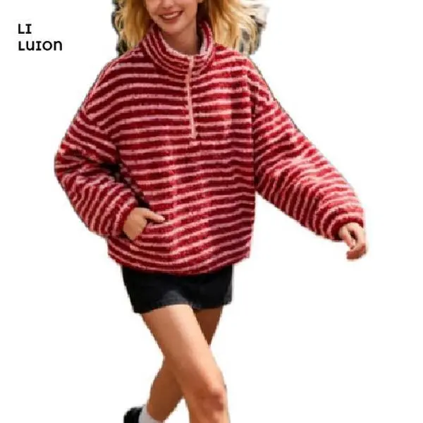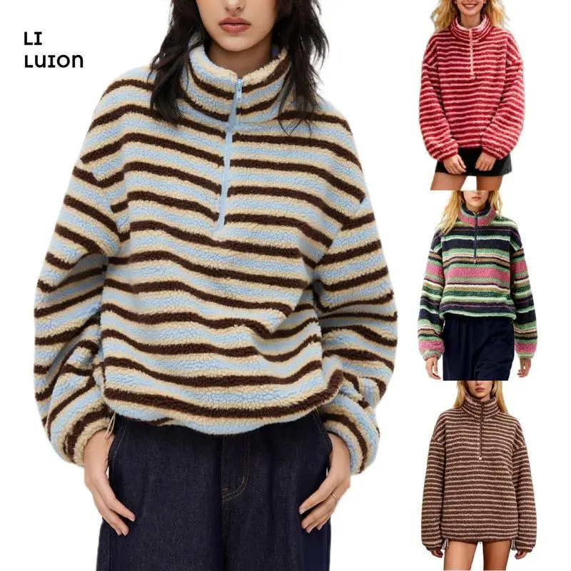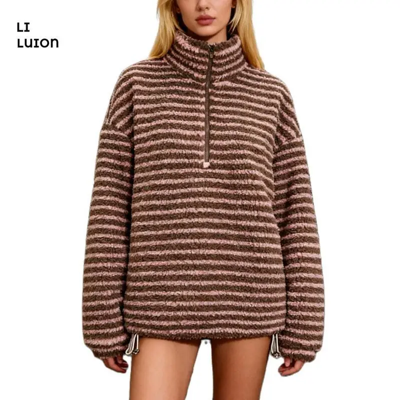 Women Winter Warm Fleece Stripe Stand Collar Drawstring Half Zip Oversized Sweatshirt
