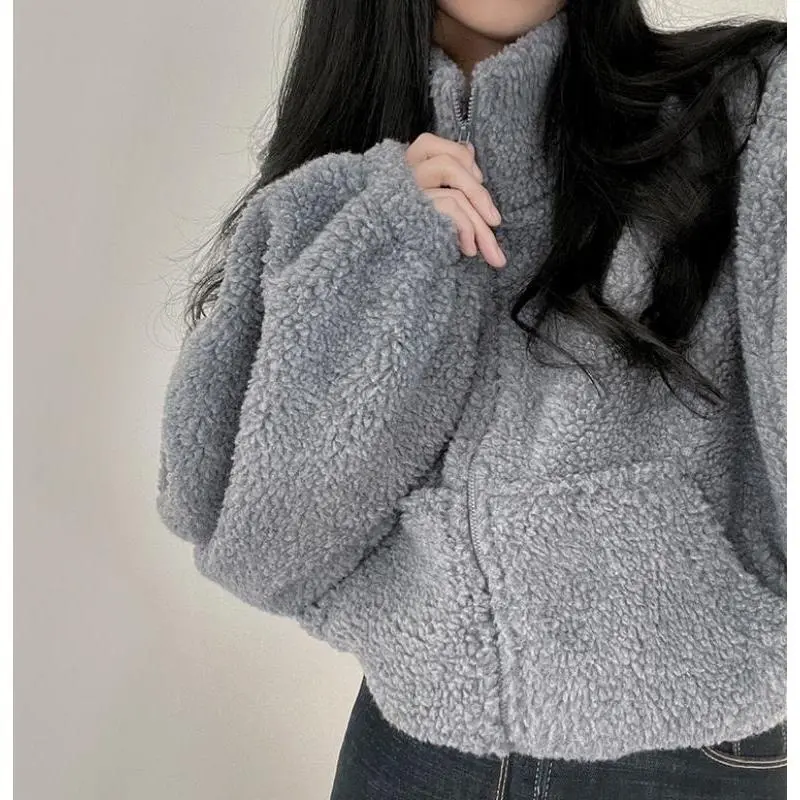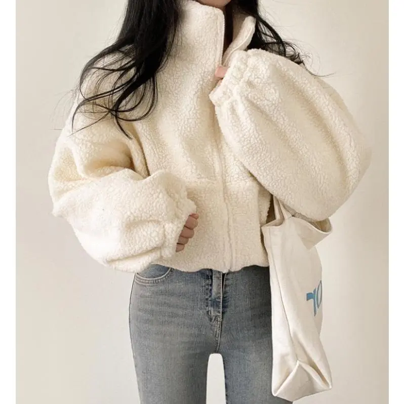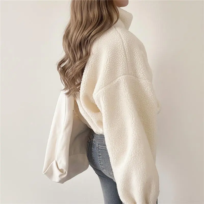 Women's Stand Collar Sherpa Fleece Jacket �C Thick Warm Zip-Up Short Coat, Cozy Oversized Fall Winter Outerwear