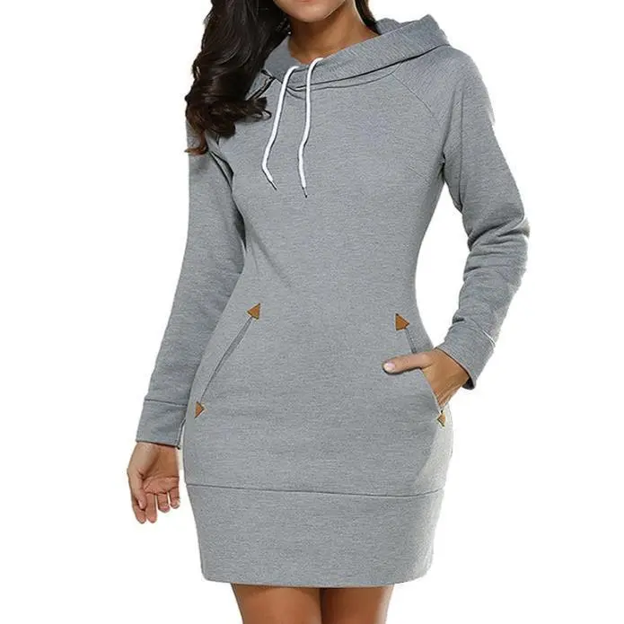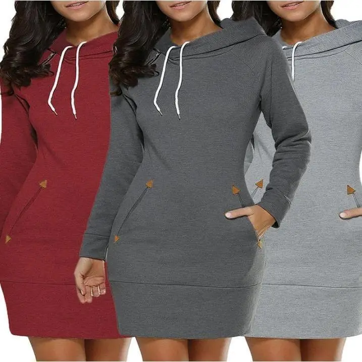 2025 Winter New Casual Dress Women Knee Length Pocket Dress Hooded Warm Sweatshirt Long Sleeve Side Zipper Neckline Simple Casual Sports Dress