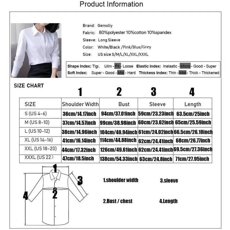 (Especially Size 2XL/ 3XL)Please refer to our size chart for the most accurate fit. As this shirt has a slim cut, if you want a little looser than the norm, please choose a larger size, thx! * BUST MEASUREMENTS: S---94cm/37.01", M---99cm/38.98", L---104cm/40.94", XL---114cm/44.88", XXL---126cm/49.61", XXXL---138cm/54.33" Feature: Simple button up shirt, featuring collared V-neckline and roll up long sleeves, finished with classic slim fit cut, perfect to show out your curves and easy to make a sexy everyday work looking Button Down Shirts Style: Classy spread collar button down shirt, professional and causal business style, in a slim fit, tuck into skinny jeans for simple cool Occasions: Suit for casual, business, office, dating, daily wear, work wear or other formal occasions, fits to any season Garment Care: Hand or machine wash in low temperature, Dark colors separately,Hang dry; Please use our size chart image as a guide before your order