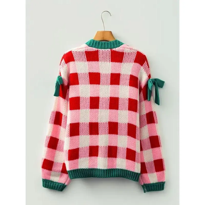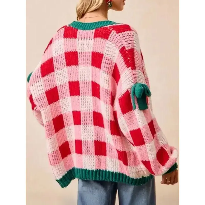 Christmas Winter Knitted Plaid Color Block Bow Tie Collarless Long Sleeve Cardigan, Casual Daily Wear, Women's Fashion Sweater