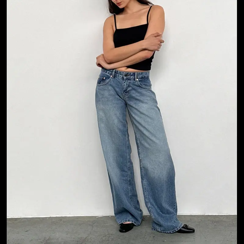 Magic ONESO Mid-low Rise Baggy Jeans Stretchy Wide Leg for Women Distressed Pants Womenswear Bottom 8001 Lady Basic Minimalist Comfortable Denim Tummy Control Curve Hugging Plus Size Regular Size BBL Spring Fashion Daily Outfits