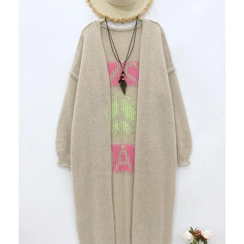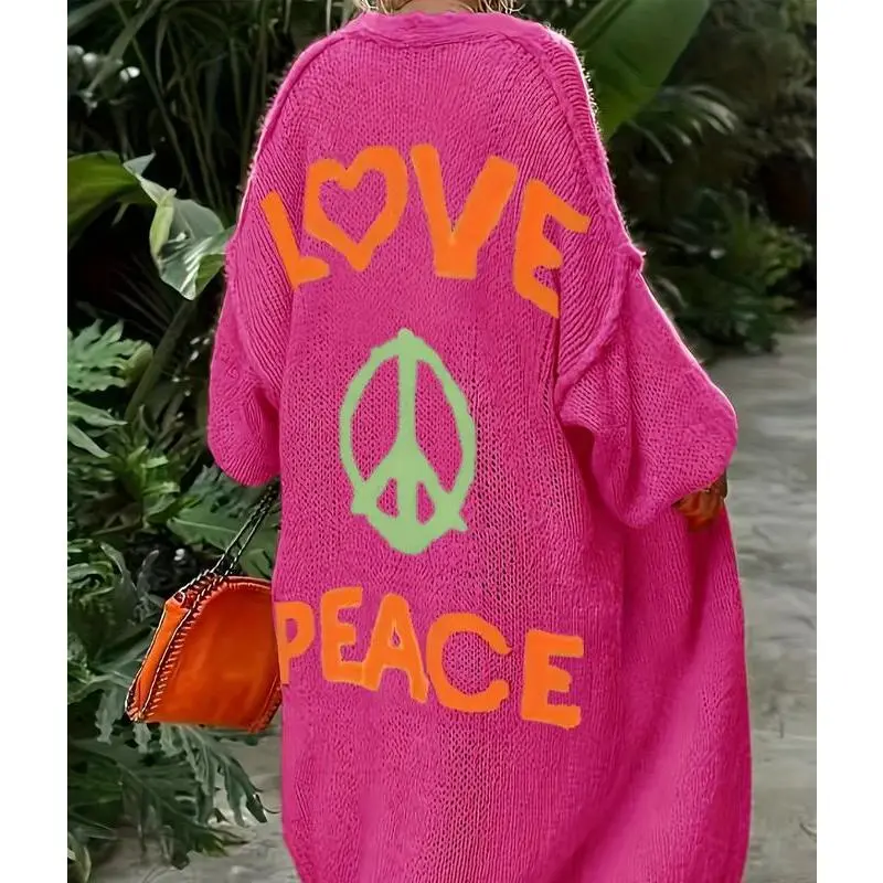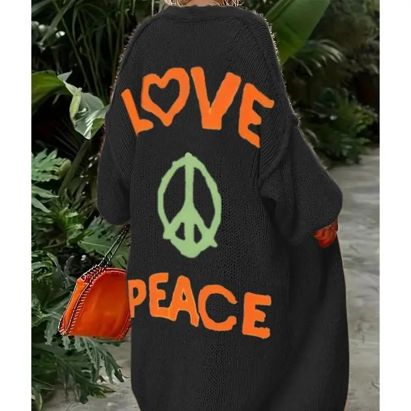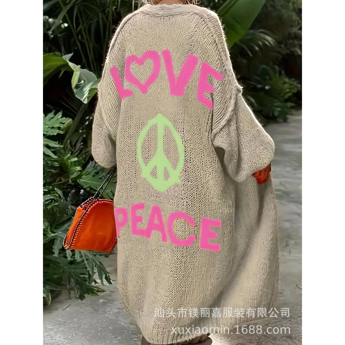 【Lengthy Coverage】: The long design offers adequate coverage, providing warmth and protection during cooler months. 【Moderate Thickness】: Crafted with a moderate fabric thickness, it is suitable for both spring and fall seasons. 【Loose Fit】: The loose-fitting silhouette allows for unrestricted movement, making it comfortable for daily wear. 【Knitted Fabric】: Made from quality knit fabric, it ensures durability and a pleasant texture against the skin. 【Letter Print】: Features a distinctive letter print that enhances visual appeal, setting it apart from typical cardigans.