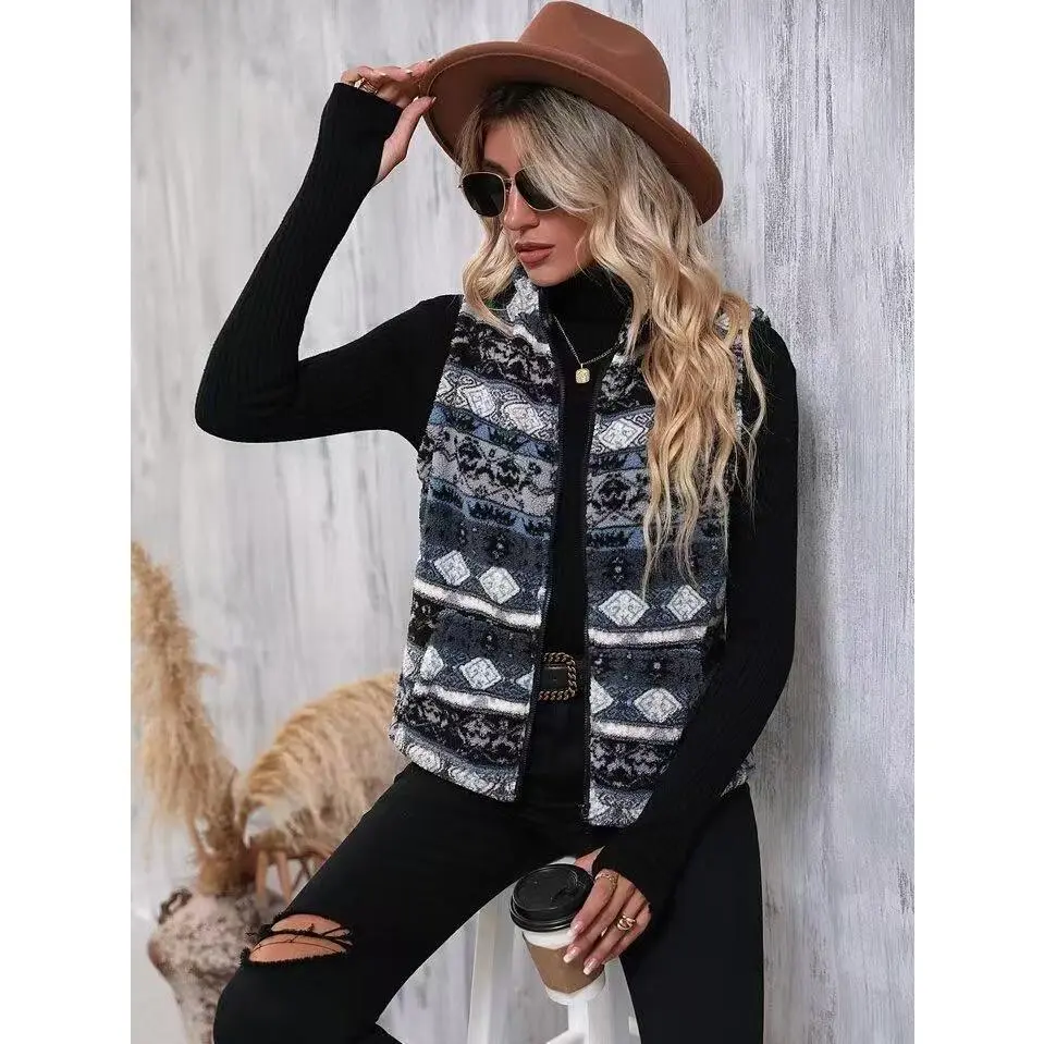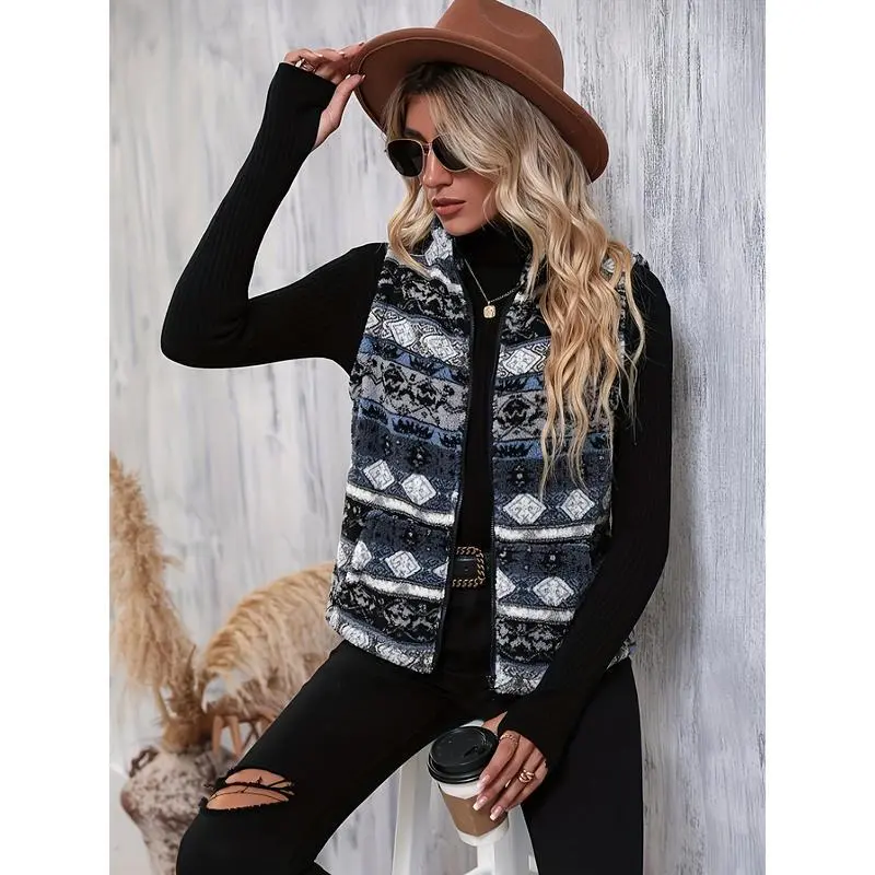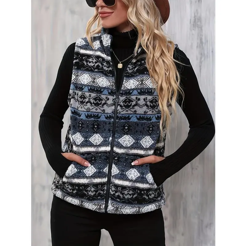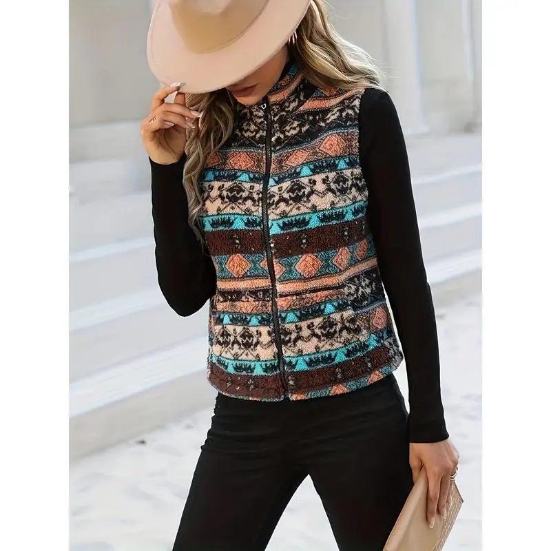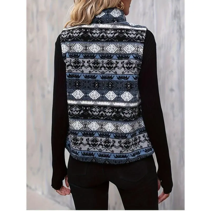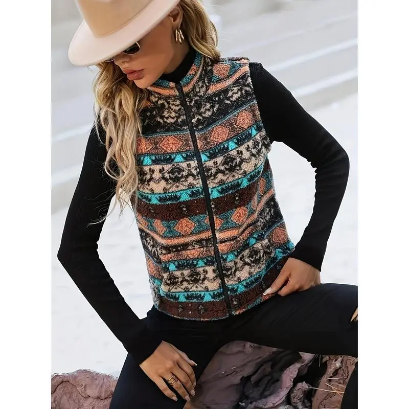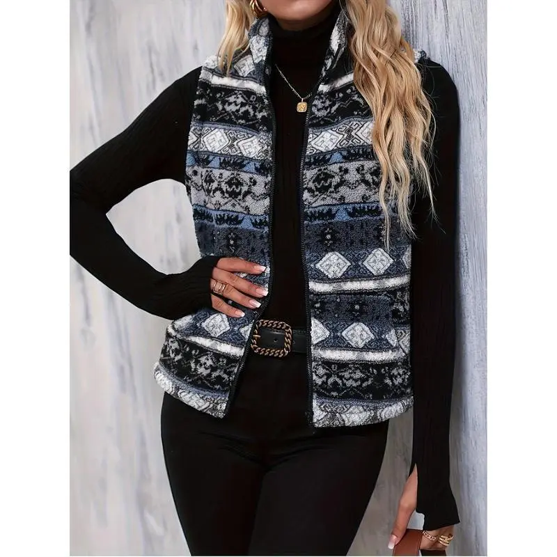 Elegant Sleeveless Warm Aztec Pattern Zip Up Teddy Vest Jacket for Winter & Fall, Women's ClothingGIFT7