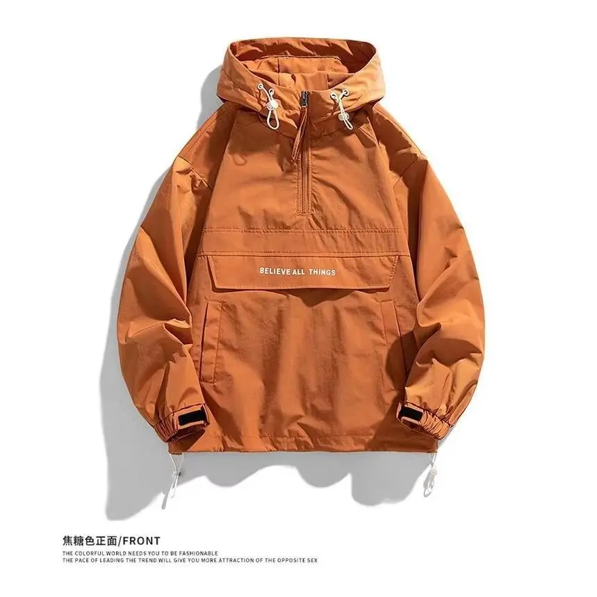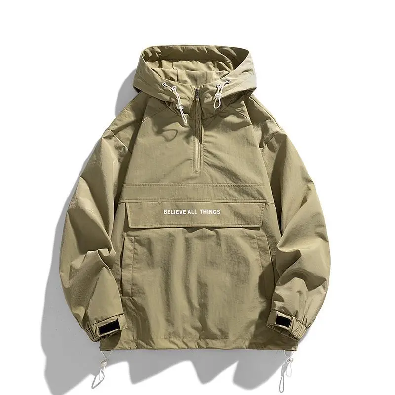 Men's Khaki Half-Zip Hooded Jacket ✨ Elevate your casual style with the Men's Khaki Half-Zip Hooded Jacket. This windbreaker features a "Believe All Things" graphic, adding a touch of inspiration to your outfit. The drawstring detail ensures a comfortable fit. Perfect for everyday wear, this jacket combines functionality with a trendy design. Stylish and Practical This khaki jacket is a must-have for your wardrobe. It combines style with practicality, making it a versatile choice for various occasions. The half-zip and drawstring features provide both convenience and comfort.