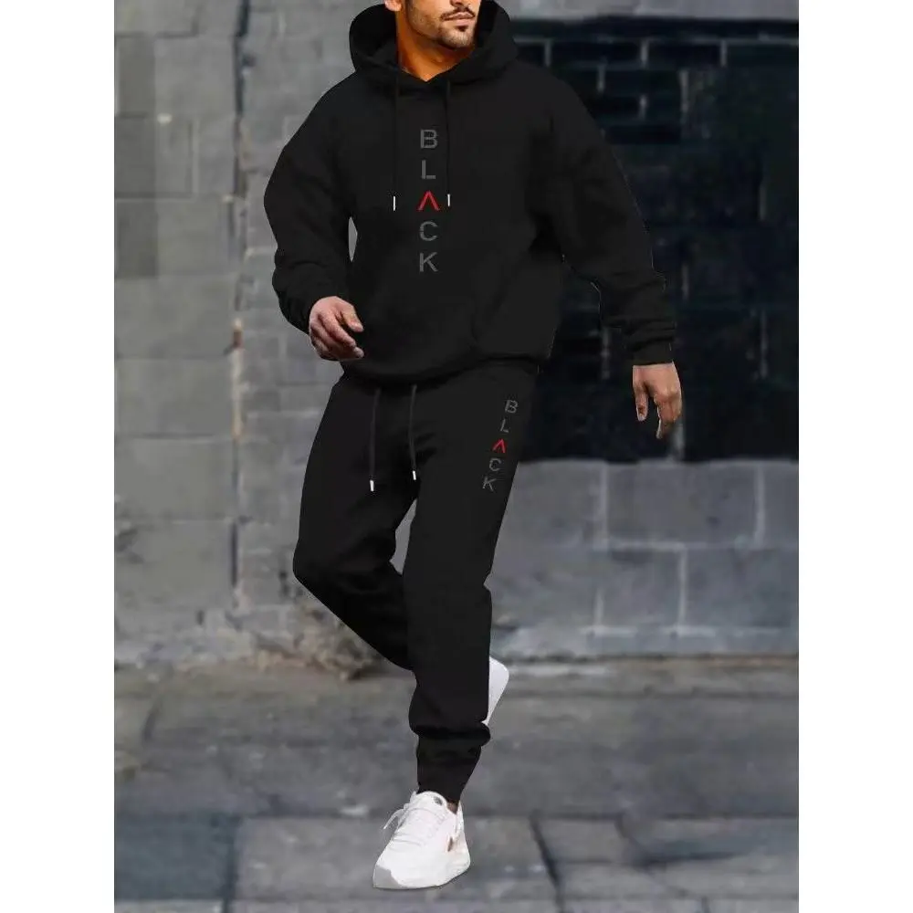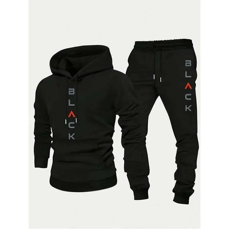 Men's Complete Outfit - Stylish Hooded Sweatshirt & Joggers Set with BLACK Print Gray Casual Streetwear Long Pants Matching Hoodie Perfect for Fall Winter Cozy Clothing Sporty Look Non Stretch Fabric